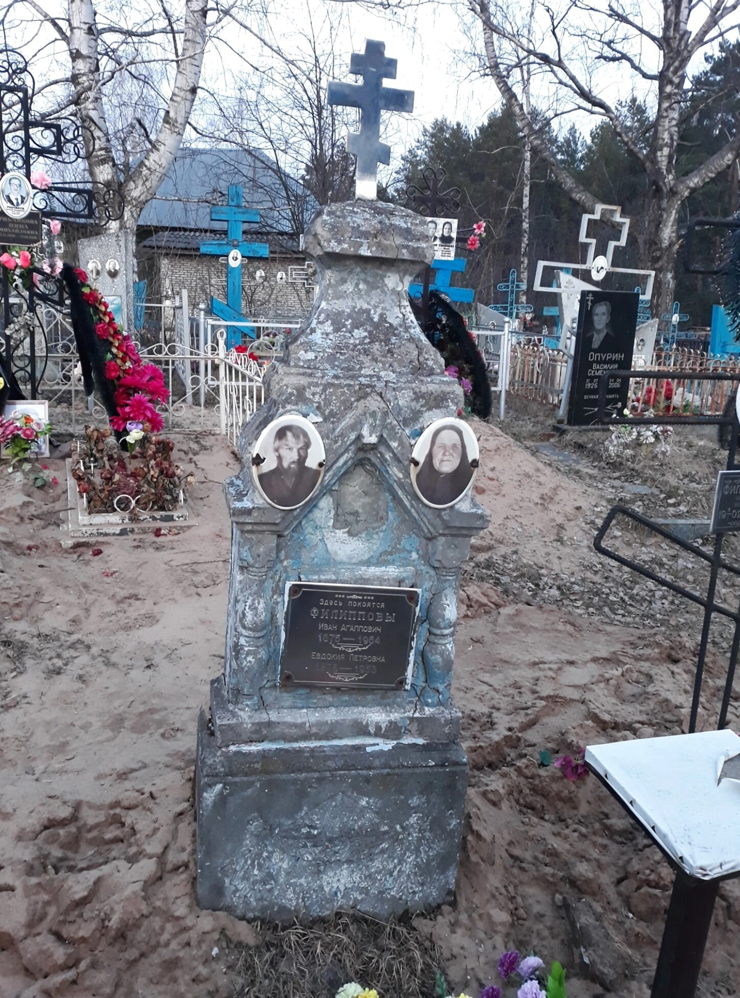 На представленной фотографии запечатлён фрагмент исторического кладбища, расположенного на территории Спасо-Преображенской церкви в селе Сухаренки Городецкого района. В центре композиции находится старинное бетонное надгробие, поросшее мхом, свидетельствующее о его многолетней истории. На памятнике установлены два овальных медальона с фотографиями усопших и металлическая табличка с частично сохранившейся надписью, на которой можно различить имена Филипповых: "ИВАН АГАПлович" и "Евдокие Петровик".