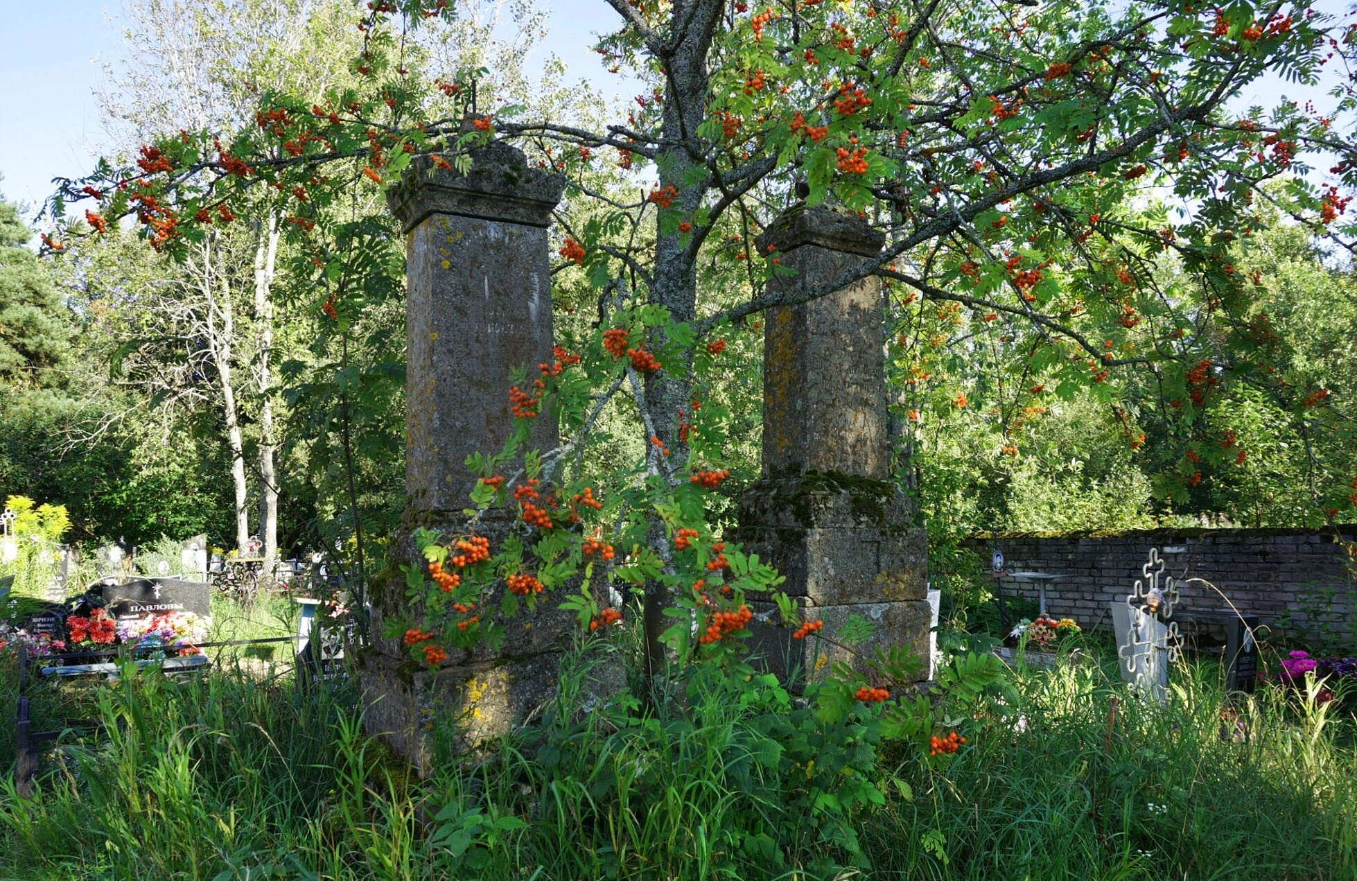 В центре композиции изображения находятся два массивных каменных столба, являющихся частью исторического парного надгробия. Эти монументальные сооружения, покрытые слоем мха и патиной времени, свидетельствуют о многовековой истории православного некрополя. Меж столбов произрастает рябина обыкновенная (Sorbus aucuparia), чьи ярко-алые гроздья ягод символически напоминают о крови Христовой и преображении смерти в жизнь вечную согласно православному вероучению.