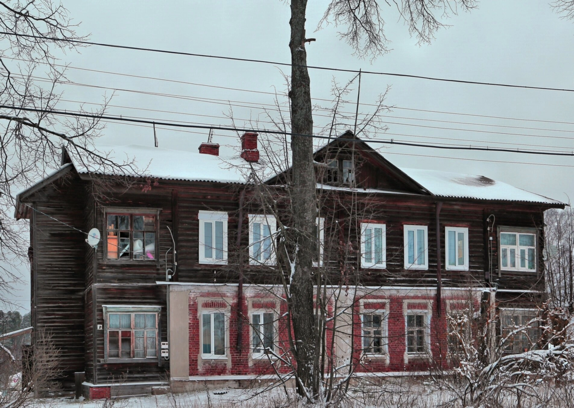 Окружающий ландшафт дополняет общую композицию: голые деревья и кустарники, укрытые снегом, создают ощущение уединенности и покоя, свойственного зимней сельской местности. На левом фасаде здания заметен современный спутниковый ресивер, что указывает на продолжающееся использование сооружения. Окна обоих этажей обрамлены белыми рамами, что характерно для традиционной русской архитектуры.