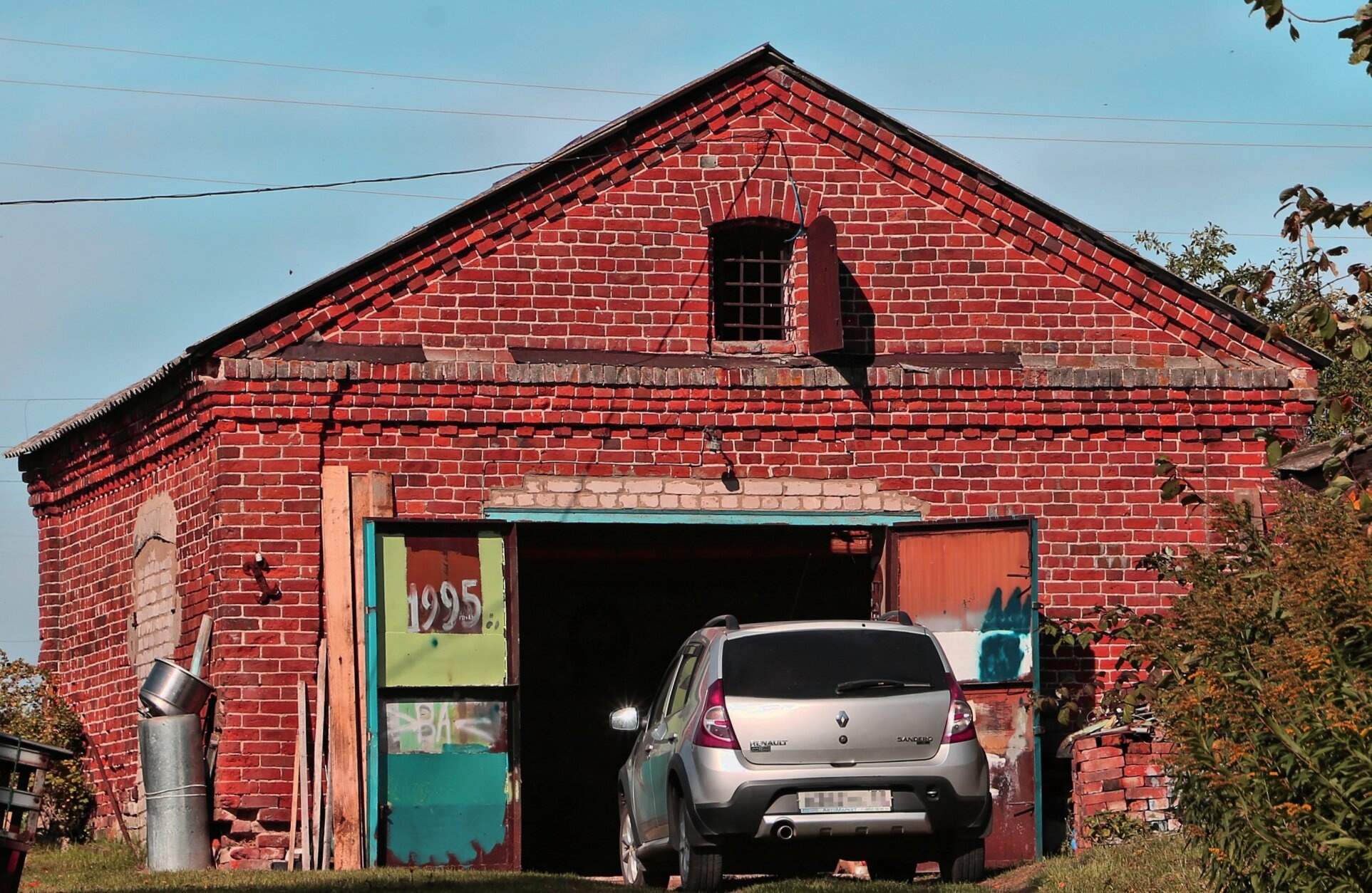 Архитектурный облик здания характерен для хозяйственных построек второй половины XIX века. Фасад выполнен из красного кирпича, что свидетельствует о традициях местного строительства того периода. На первом этаже просматриваются три дверных проема, два из которых закрыты металлическими воротами, сохранившимися с прошлых времен. Оконные проемы на обоих этажах заложены или закрыты деревянными щитами, что указывает на временное неиспользование помещения.