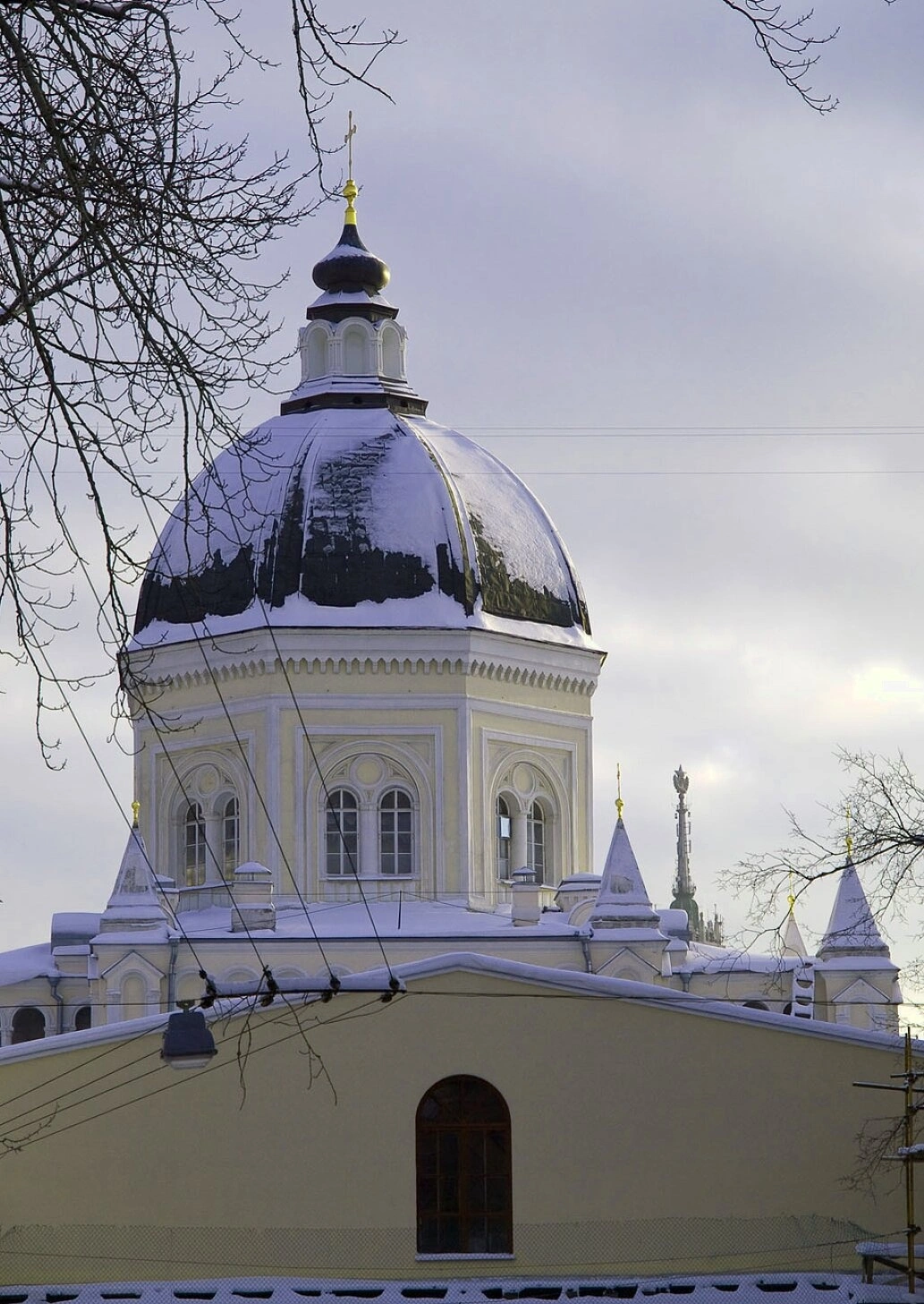 На фотографии запечатлён величественный вид собора Усекновения Главы Иоанна Предтечи, являющегося главным храмом Ивановского ставропигиального женского монастыря в Москве. Снежный покров, укутавший свод чёрного купола и голые ветви деревьев, указывает на зимнее время года, создавая атмосферу благоговейной тишины и спокойствия.