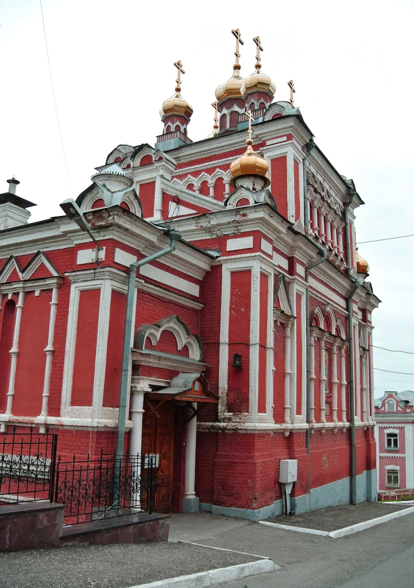На представленной фотографии запечатлён величественный архитектурный ансамбль Иверского женского монастыря в городе Самаре. Снимок выполнен с бокового ракурса, что позволяет в деталях рассмотреть благолепие одного из корпусов святой обители. Здание, выстроенное из красного кирпича с изящными белоснежными декоративными элементами, воплощает в себе лучшие традиции русского церковного зодчества. Над строением возносятся златые купола, увенчанные святыми крестами, сияющими в лучах солнца.