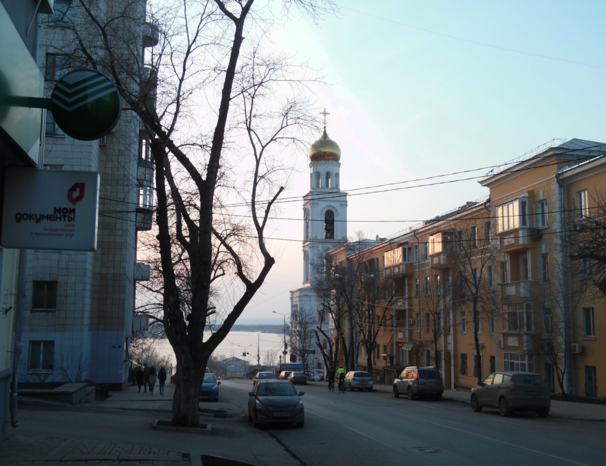 Снимок передаёт спокойную атмосферу городского пейзажа, где современная жизнь гармонично сочетается с историческим православным наследием. Светлое небо и отсутствие листвы на деревьях указывают на осенне-зимний период, когда золотое завершение храма особенно ярко выделяется на фоне окружающего пространства.