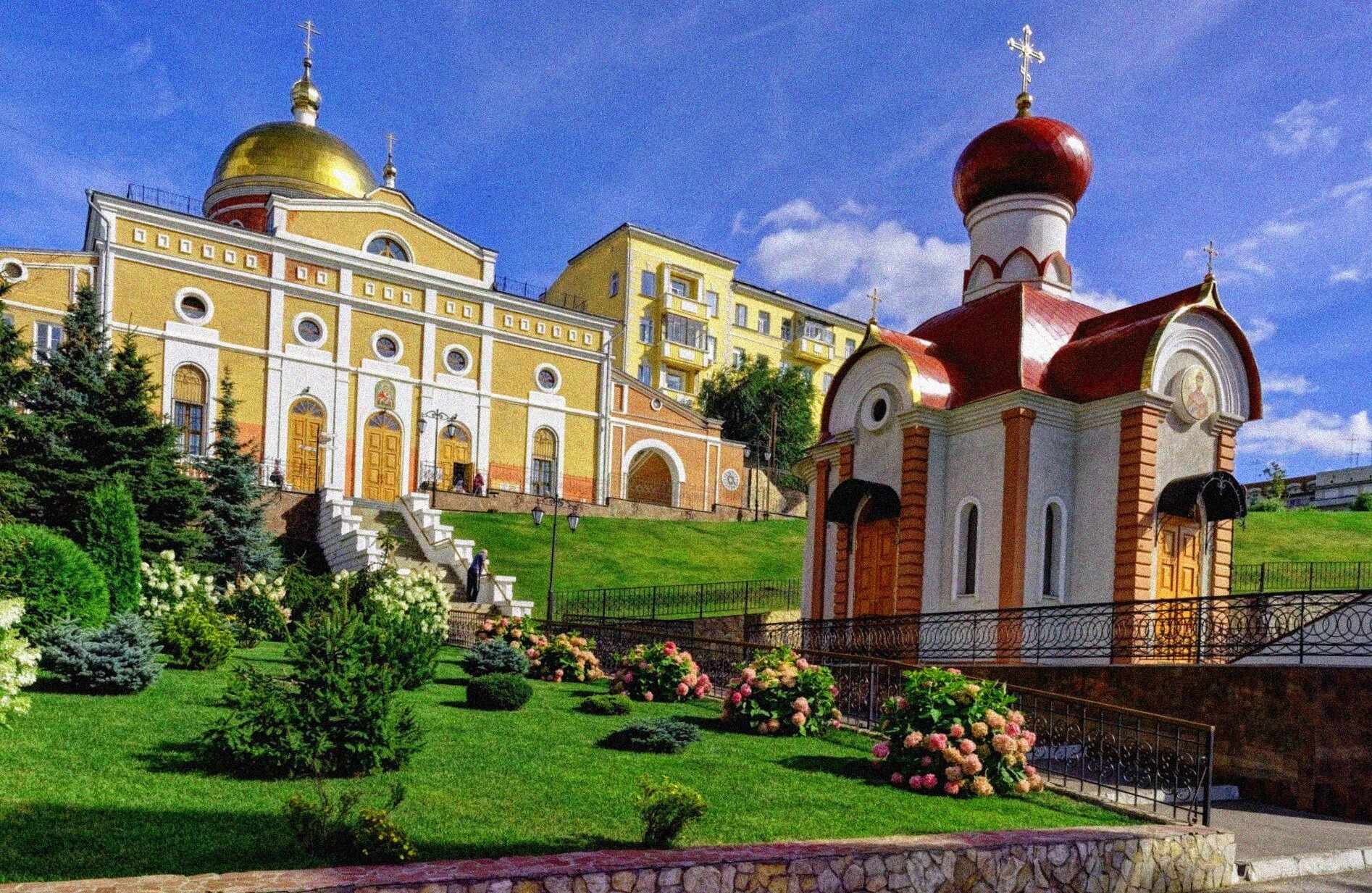На фотографии запечатлён величественный ансамбль Иверского женского монастыря в городе Самаре, одной из главных православных святынь Поволжья. На заднем плане монументально возвышается главный храм обители — пятиглавый Иверский собор, увенчанный сияющими на солнце златоглавыми куполами. Его архитектура выдержана в русско-византийском стиле и воплощает в себе традиции церковного зодчества.