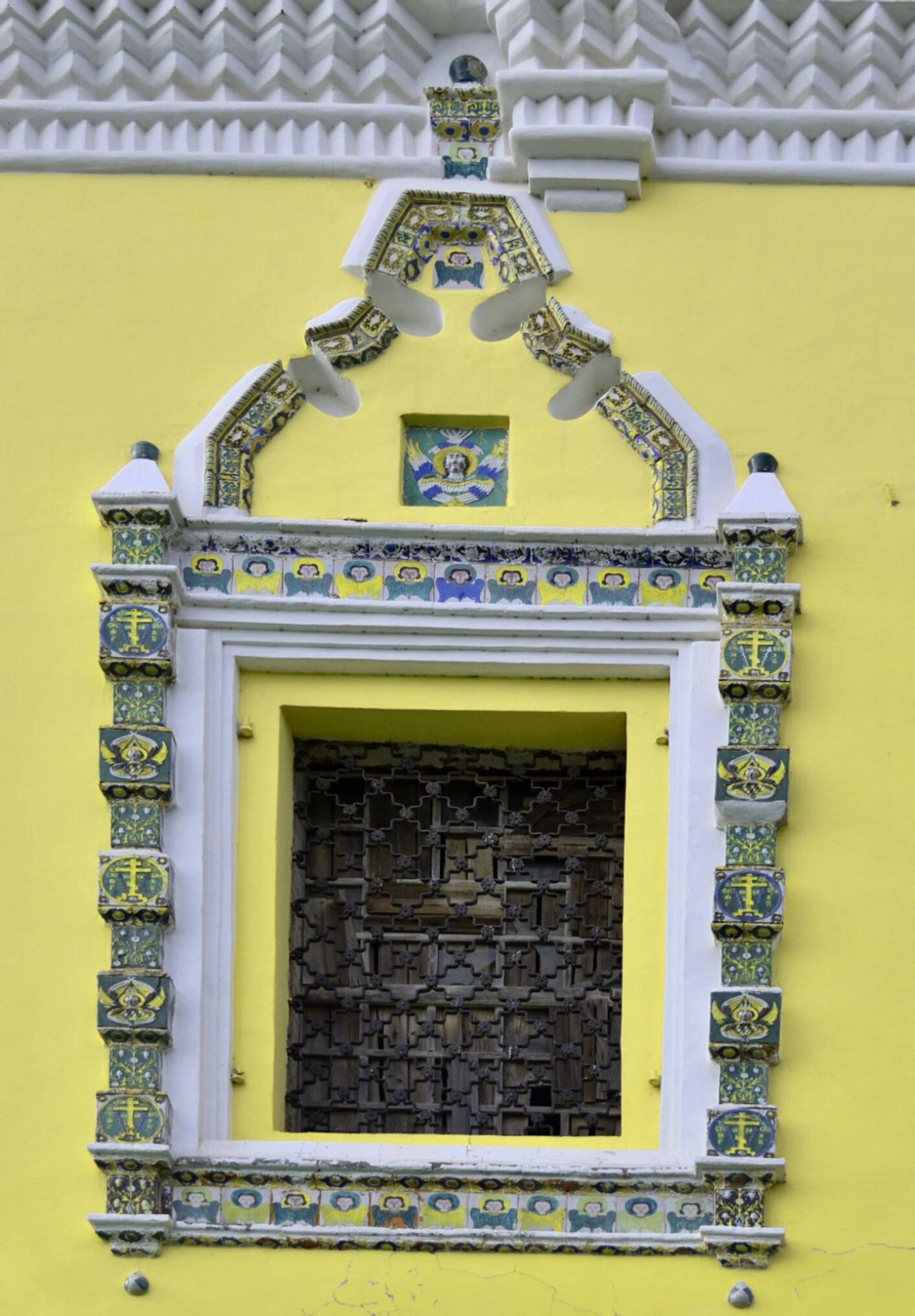 На представленной фотографии запечатлено уникальное архитектурное решение — оконный наличник, богато украшенный полихромными изразцами, являющийся частью стены жёлтого цвета. Данный объект принадлежит Церкви Рождества Пресвятой Богородицы, что в селе Горицы Костромской области, являющейся выдающимся памятником русской архитектуры последней четверти XVII века.