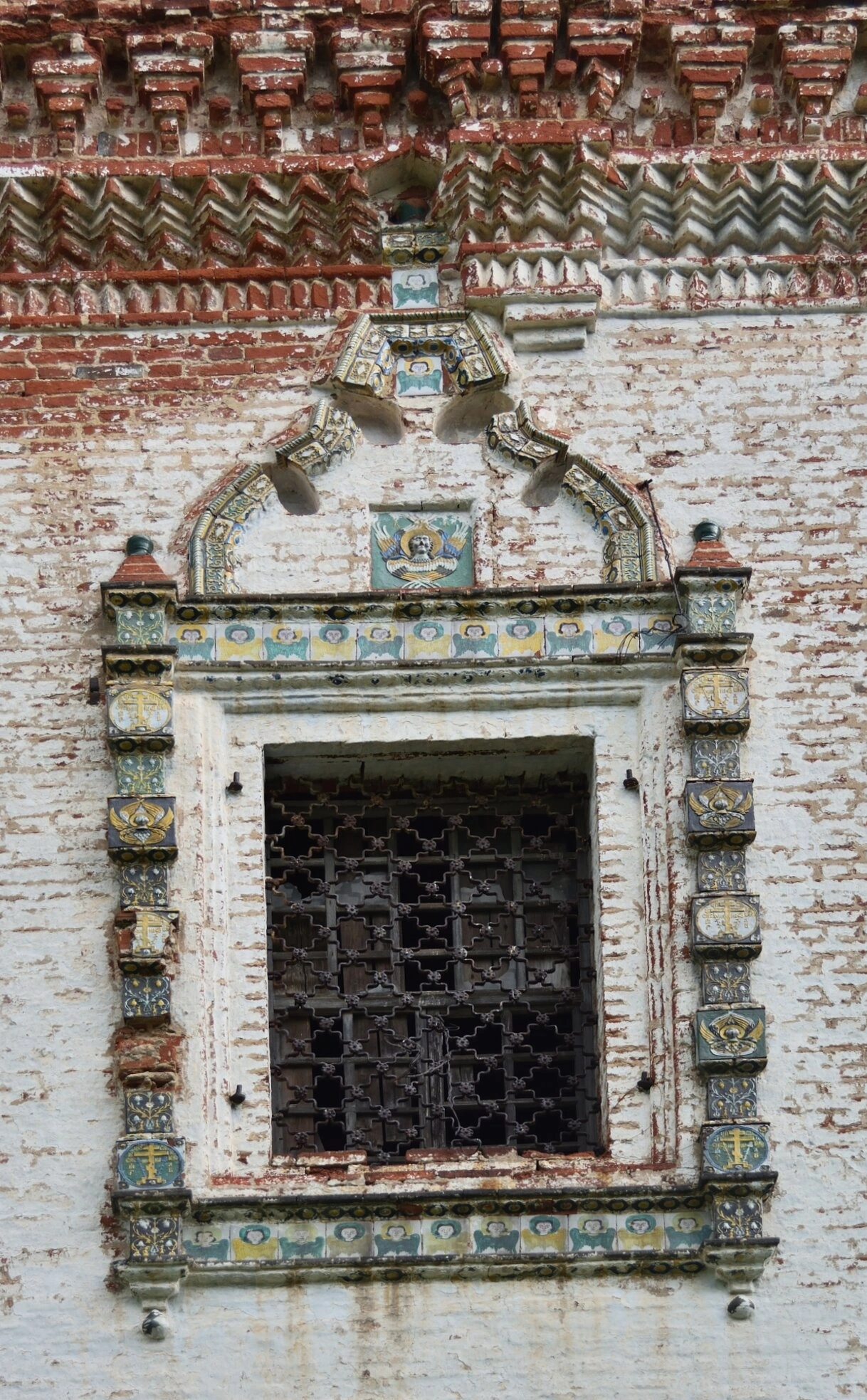 Над окном возвышается килевидный кокошник, являющийся неотъемлемой частью архитектурного образа русского храма. Кокошник также обильно украшен изразцами и дополнен узорной кирпичной кладкой, создавая сложный и живописный рельеф. Завершает композицию прочная кованая решетка, оберегающая святой алтарь от внешнего мира. Вся эта декоративная композиция не только служит украшением, но и отражает стремление древних мастеров к прославлению Дома Божия через искусство, превращая камень и глину в гимн Творцу.