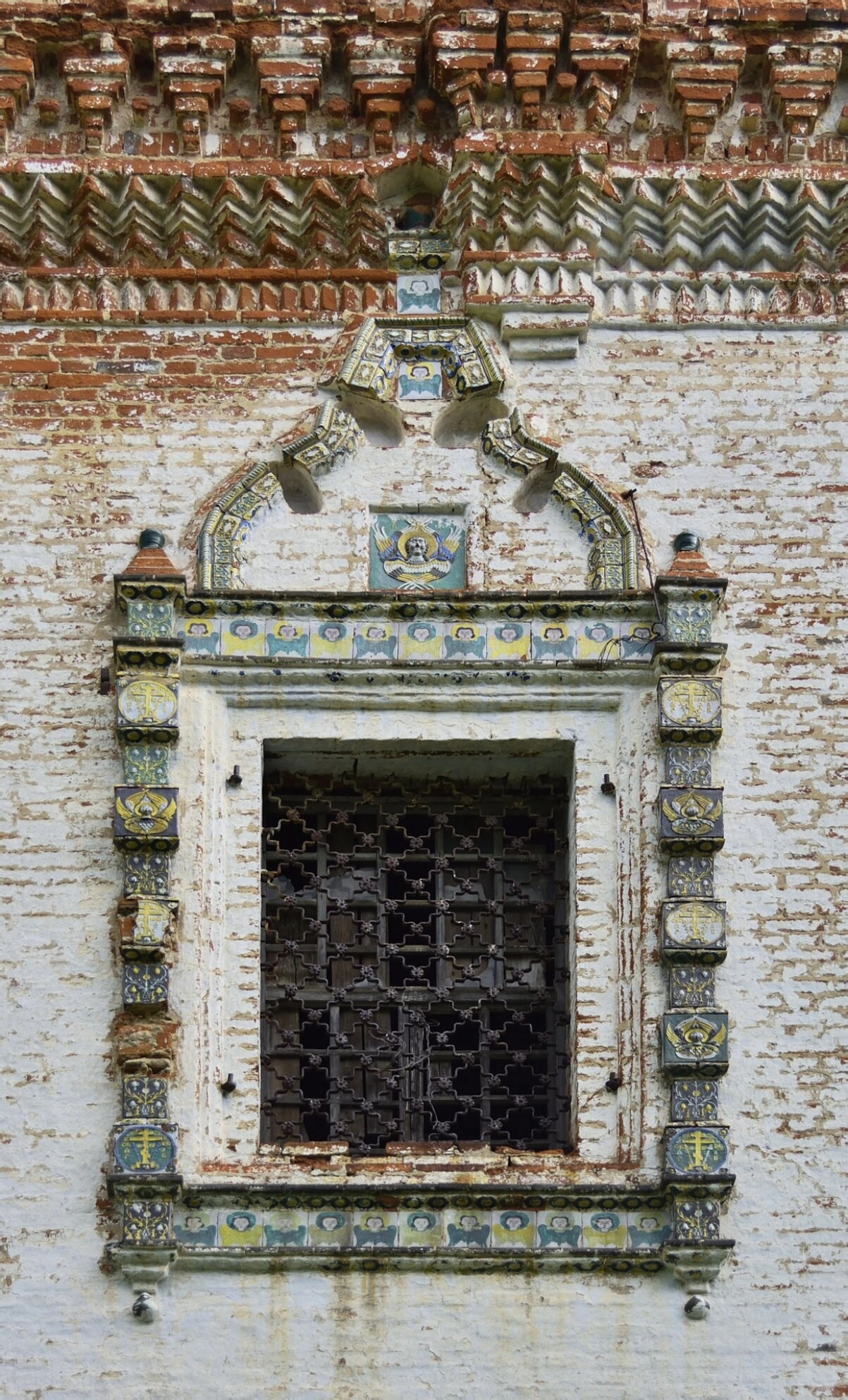 Окно дополнительно защищено ажурной кованой решеткой, которая не только выполняет утилитарную функцию, но и служит элементом декора, гармонично дополняя изразцовое убранство. Подобное внимание к деталям характерно для русских мастеров, стремившихся к созиданию красоты во славу Господа.