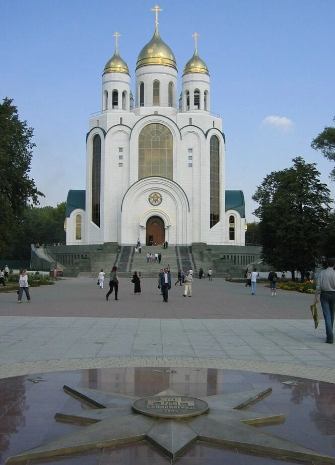 На представленной фотографии запечатлён величественный Кафедральный собор Христа Спасителя, являющийся кафедральным собором Калининградской епархии Русской православной церкви. Храм располагается в центре Калининграда на площади Победы, что точно соответствует предоставленным географическим координатам.