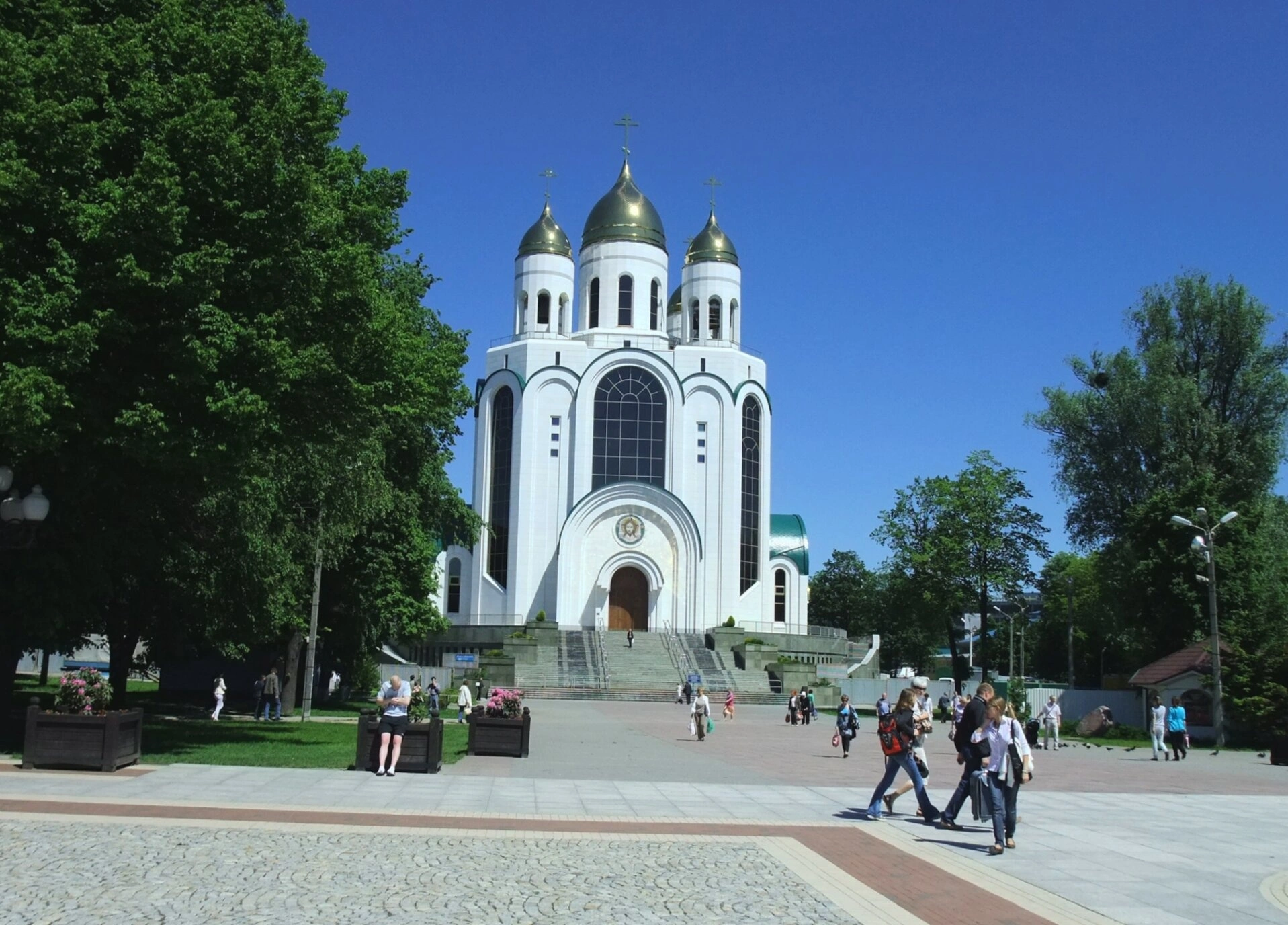На представленной фотографии запечатлён величественный Кафедральный собор Христа Спасителя, являющийся главным православным храмом Калининграда. Он возвышается в центре площади Победы, символизируя духовное возрождение региона. Собор был возведён в начале 2000-х годов по проекту архитектора Олега Копылова как памятник в честь победы в Великой Отечественной войне и в память о погибших воинах.