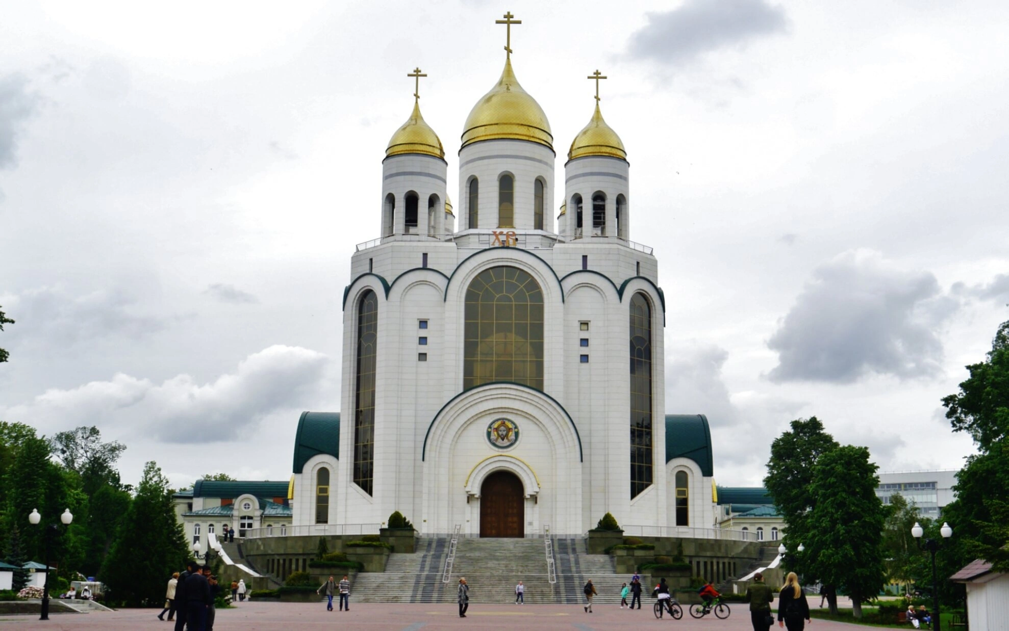 На представленной фотографии запечатлён величественный Кафедральный собор Христа Спасителя — главный православный храм Калининградской епархии. Снимок демонстрирует монументальный фасад здания, выполненный в белых тонах, и сияющие на солнце золочёные купола, увенчанные православными крестами.