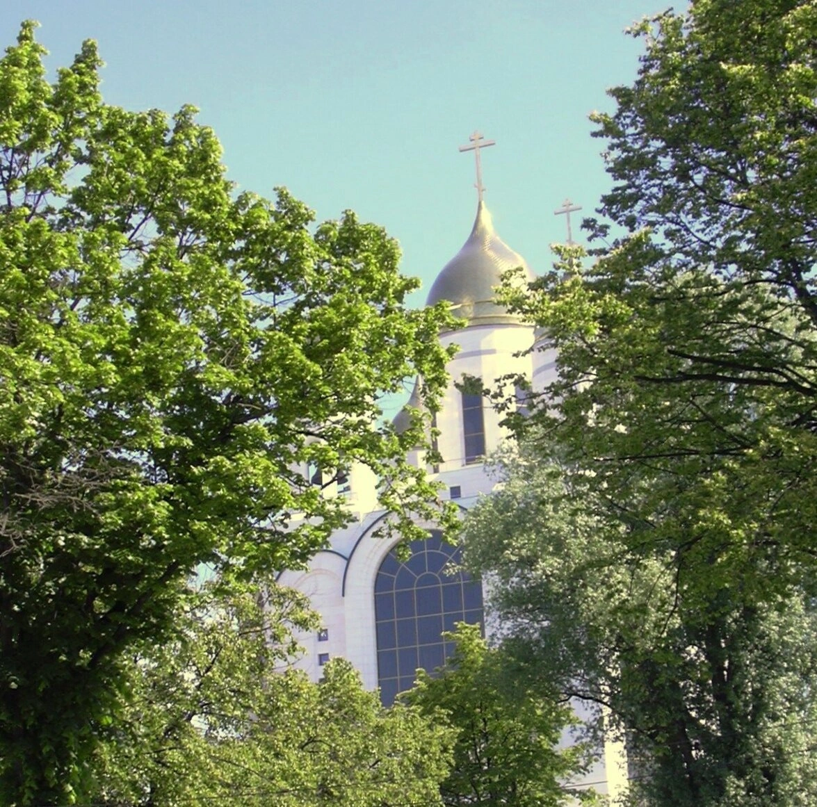 Снимок сделан в ясный солнечный день, благодаря чему сияние золотого купола и белизна стен создают особое возвышенное настроение. Центральный золотой купол, увенчанный православным крестом, символизирует Господа Иисуса Христа, а его яркое сияние подчёркивает святость и благодать этого места. Собор изображён сквозь зелёную листву деревьев, что придаёт кадру ощущение умиротворённости и естественной красоты, гармонично вписывая творение рук человеческих в божий мир.