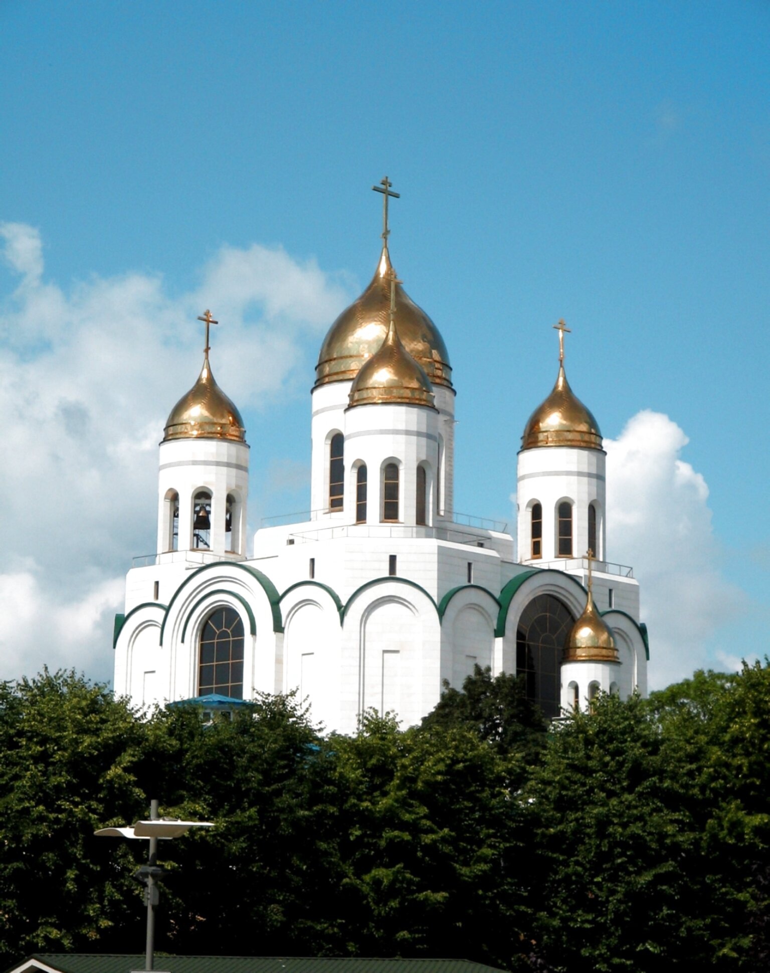 На переднем плане фотографии видны кроны деревьев, сквозь которые открывается благостный вид на святыню, что придаёт изображению особую глубину и ощущение присутствия. На заднем плане простирается чистое голубое небо с легкими облаками, символизирующее мир и благодать, нисходящие на землю от самого Господа. Этот собор был построен в начале XXI века как символ памяти по погибшим воинам и как знак непрерывности православной традиции на этой земле.