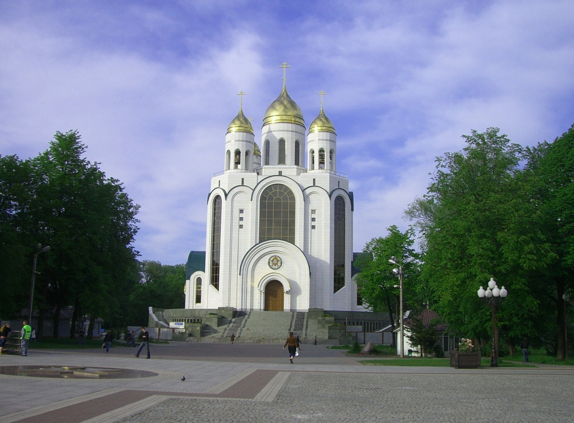 На представленной фотографии запечатлён величественный Кафедральный собор Христа Спасителя, являющийся главным православным храмом Калининграда и кафедральным собором Калининградской епархии Русской православной церкви. Собор возвышается в самом сердце города, на площади Победы, символизируя духовное возрождение Калининградской земли после десятилетий забвения.
