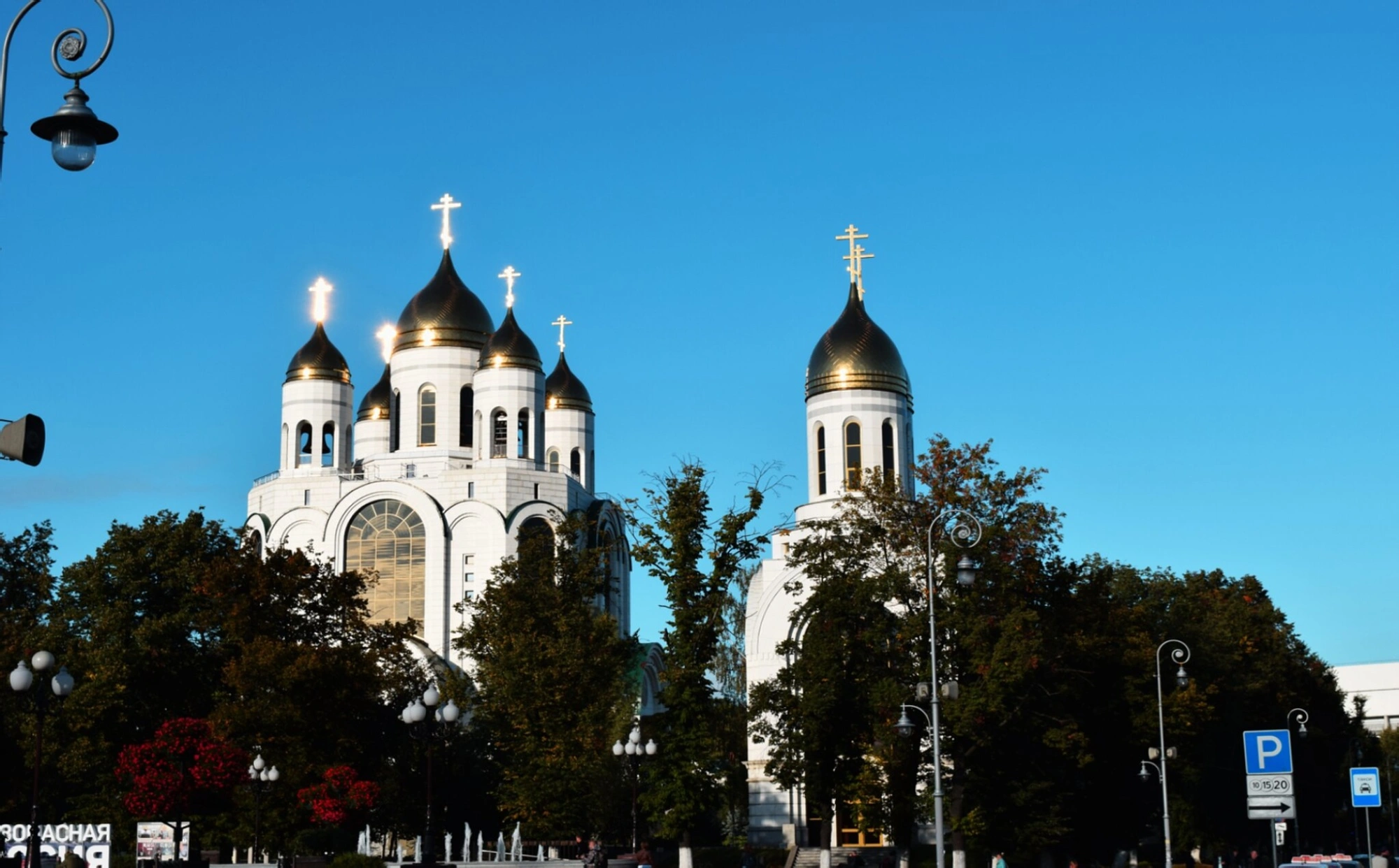 Собор был возведён в начале XXI века по проекту архитектора Олега Копылова как символ возрождения Православия на земле бывшей Восточной Пруссии. Его строительство и последующее освящение стало знаковым событием для всей русской духовной жизни. На фотографии храм изображён в ясный день, где лазурное небо подчёркивает чистоту и благодатную силу этого святого места, а окружающая зелень деревьев создаёт естественное живописное обрамление. Собор является не только архитектурной доминантой площади, но и средоточием молитвенной жизни православных христиан Калининградской земли.