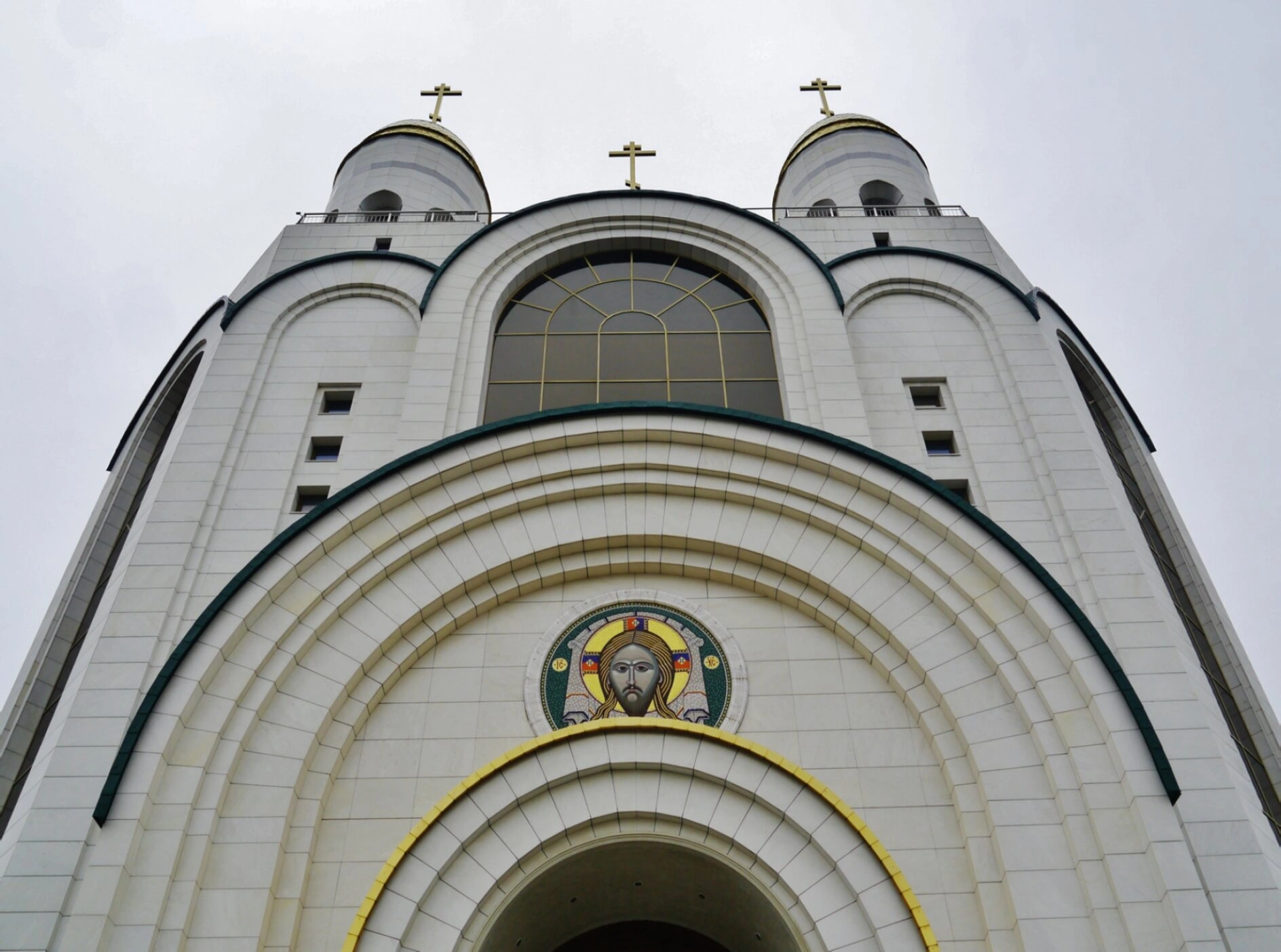 На представленной фотографии запечатлён величественный фасад Кафедрального собора во имя Христа Спасителя — главного православного храма Калининграда. Снимок выполнен снизу вверх, что позволяет в полной мере оценить монументальность и духовную мощь этого святого места, возведённого на площади Победы.