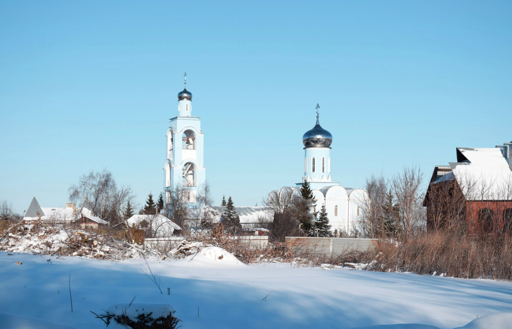 На представленной фотографии запечатлён кафедральный собор в честь чудотворной иконы Божией Матери «Взыскание погибших», расположенный в городе Ефремов Тульской области. Храм, являющийся одной из духовных доминант города, изображён в благоговейном зимнем убранстве, когда пушистый снег окутывает его земли, придавая всему окружающему пространству особую, торжественную чистоту и безмолвие.