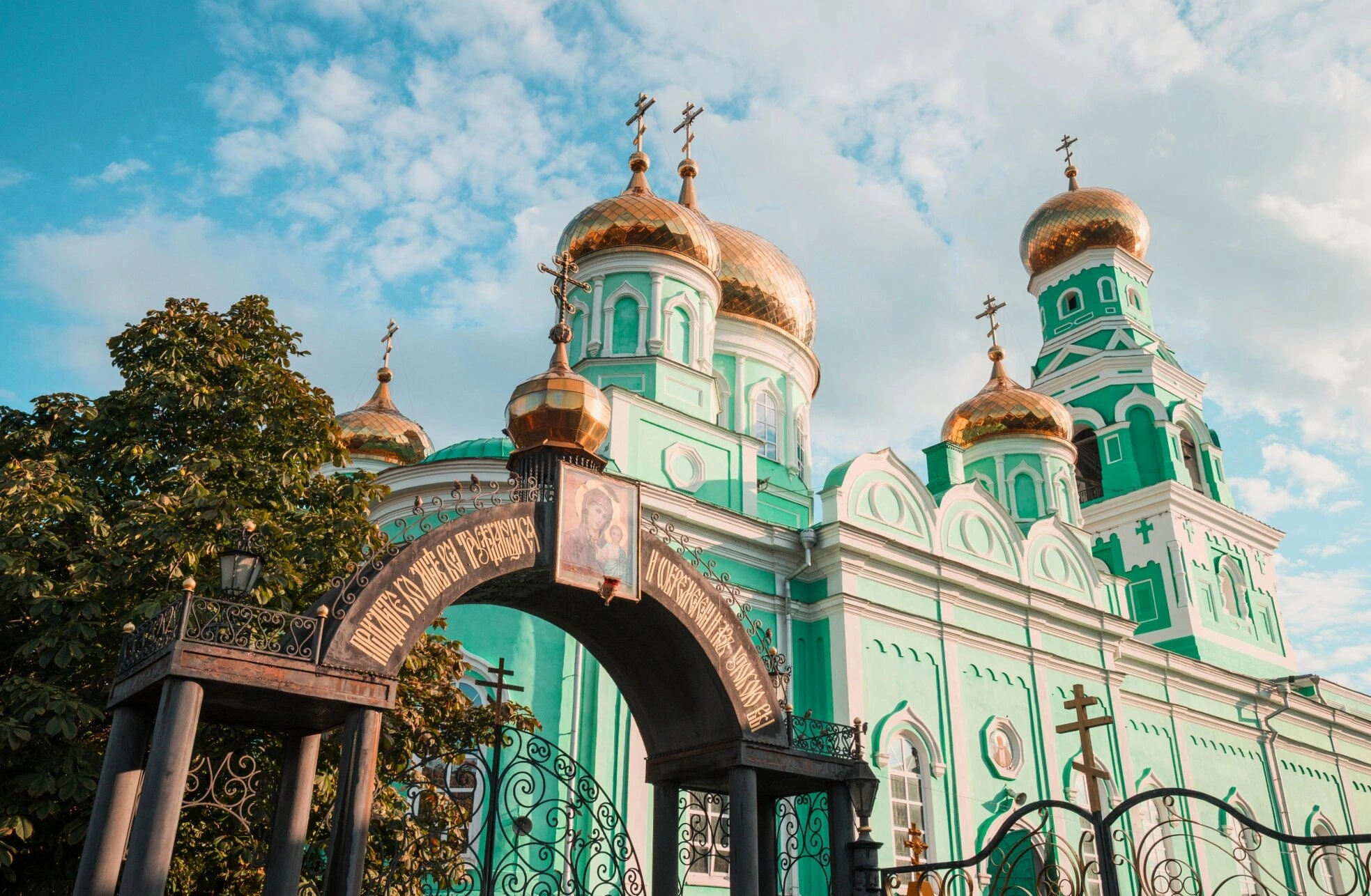На переднем плане фотографии видна ажурная металлическая арка, ведущая к входу в собор. Эта арка, украшенная православной иконой и благочестивыми надписями, является традиционным элементом оформления святых мест и обозначает вход на освящённую территорию. Храм окружён благодатной зеленью деревьев, а над ним простирается голубое небо с облаками, создавая ощущение божественного присутствия и благодати.