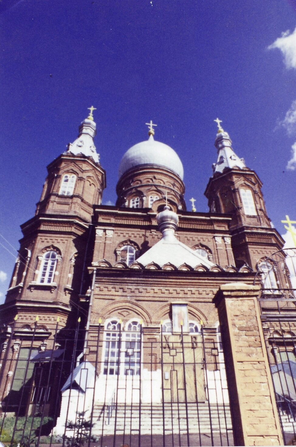 Снимок сделан с нижнего ракурса, что позволяет в полной мере оценить масштаб и высоту сооружения, устремлённого в небесную высь. На переднем плане видна чугунная ограда, обозначающая границу святой территории. Собор был возведён в 1865–1890 годах на средства сердобских купцов и прихожан вместо обветшавшей деревянной церкви. Несмотря на годы лихолетий и закрытие в советский период, храм сохранил свой первоначальный облик и ныне является действующим, собирая под своими сводами верующих для молитвы.