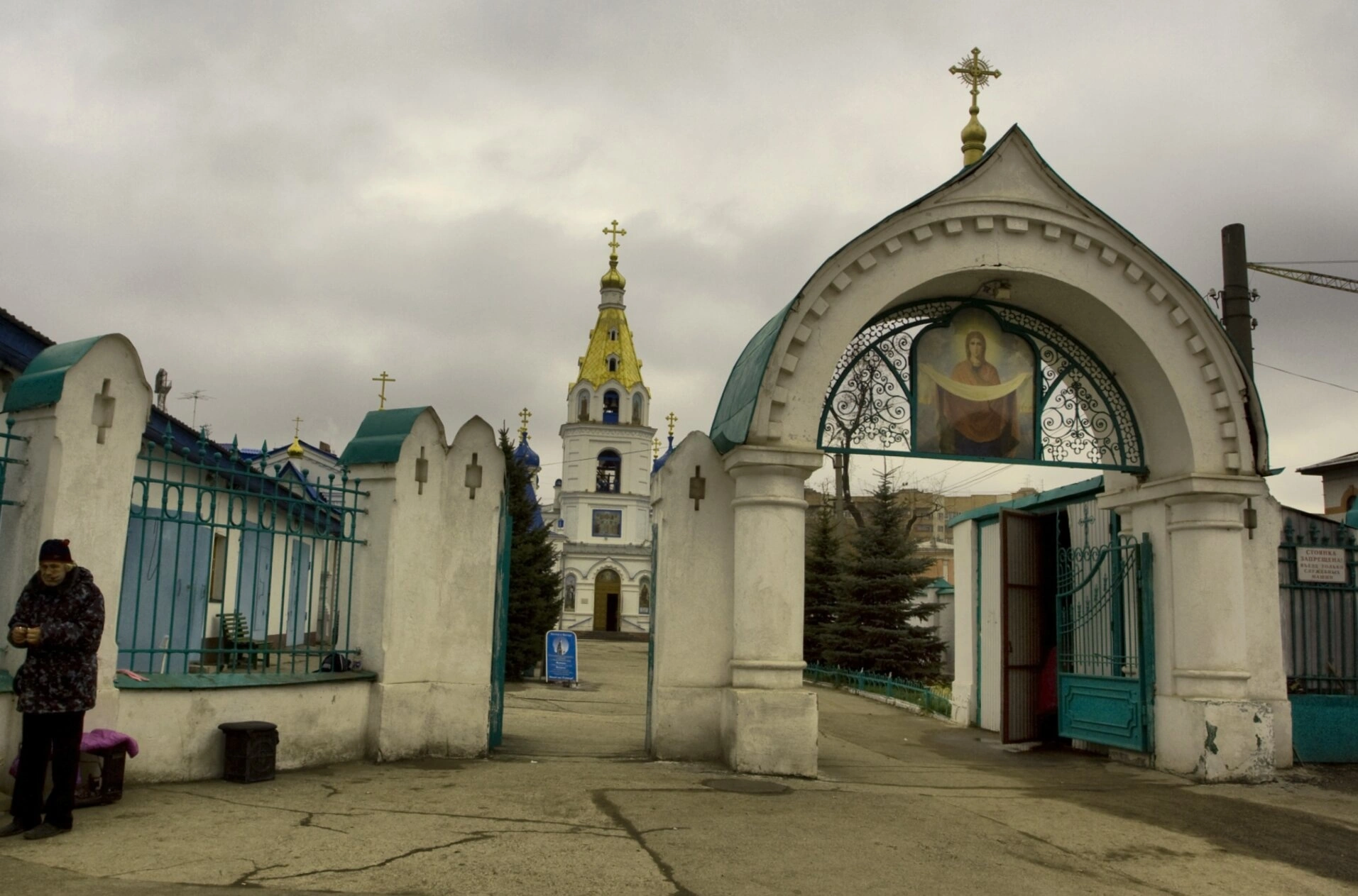 На переднем плане фотографии, слева от собора, видна фигура человека, что позволяет оценить масштаб сооружения. На заднем плане просматриваются городские постройки и пасмурное небо, создающее особую атмосферу духовного умиротворения. Покровский кафедральный собор является не только местом молитвенного служения, но и важным памятником русской церковной архитектуры, сохраняющим традиции православного зодчества.