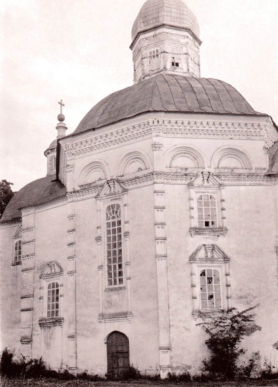 На представленной чёрно-белой фотографии запечатлён Кафедральный собор Рождества Христова, являющийся главным православным храмом древнего города Стародуба Брянской области. Снимок позволяет в деталях рассмотреть величественную архитектуру святыни, возведённой в стиле классицизма с элементами барокко. Чётко видны массивный центральный купол, увенчанный православным крестом, а также симметричные фасады и арочные оконные проёмы, характерные для церковного зодчества XVIII-XIX веков.