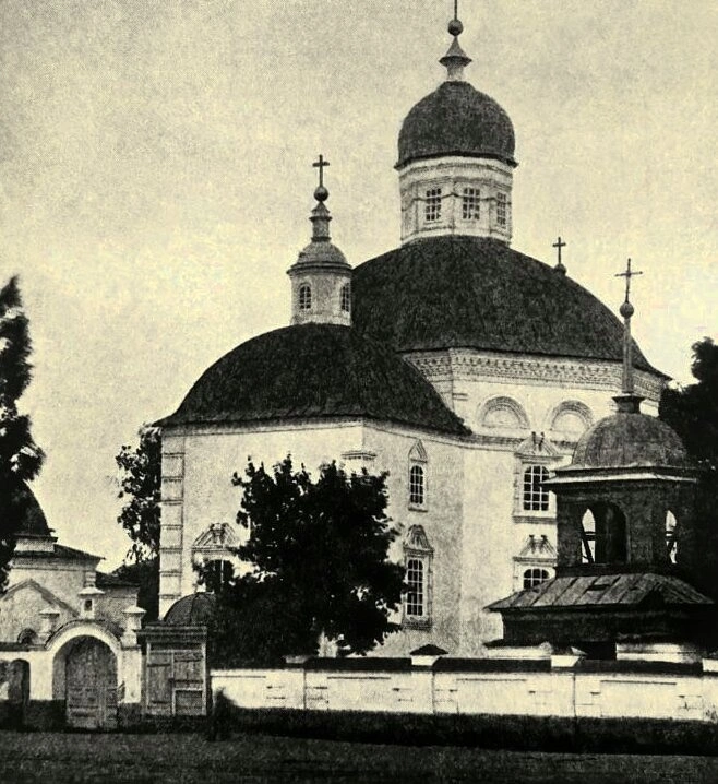 На переднем плане фотографии просматривается часть ажурной ограды с Святыми воротами, ведущими на соборную территорию. Вокруг храма растут деревья, что создаёт ощущение уединённости и покоя, свойственного древним обителям. Несмотря на испытания XX века, собор сохранил свой благолепный вид и продолжает быть местом молитвенного служения Богу. Данный исторический снимок позволяет оценить первоначальный замысел зодчих и величие православной святыни Стародубской земли.