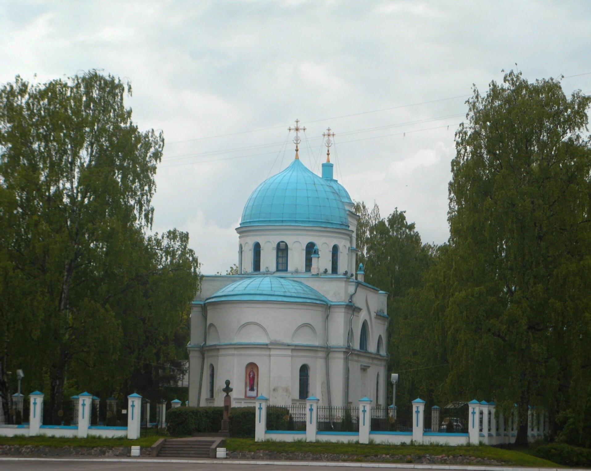 На переднем плане фотографии можно различить элементы чугунной ограды и небольшой памятник, что дополняет общий вид соборного комплекса. Расположенный по координатам 61.03564100; 30.11399700, собор находится в исторической части города, привлекая к себе не только паломников, но и всех ценителей русской культуры и истории.
