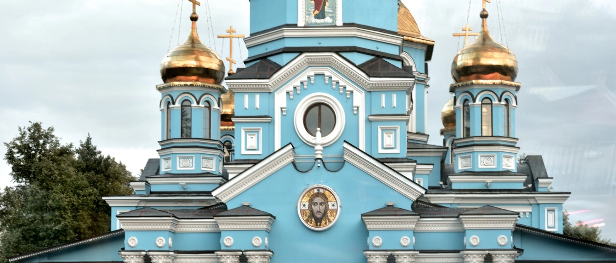 На фотографии запечатлён кафедральный собор Рождества Пресвятой Богородицы — главный православный храм Уфы и всей Башкортостанской митрополии. Величественное здание, выдержанное в небесно-голубых тонах с белоснежной отделкой и увенчанное златыми куполами, является одной из архитектурных доминант и духовным символом города.