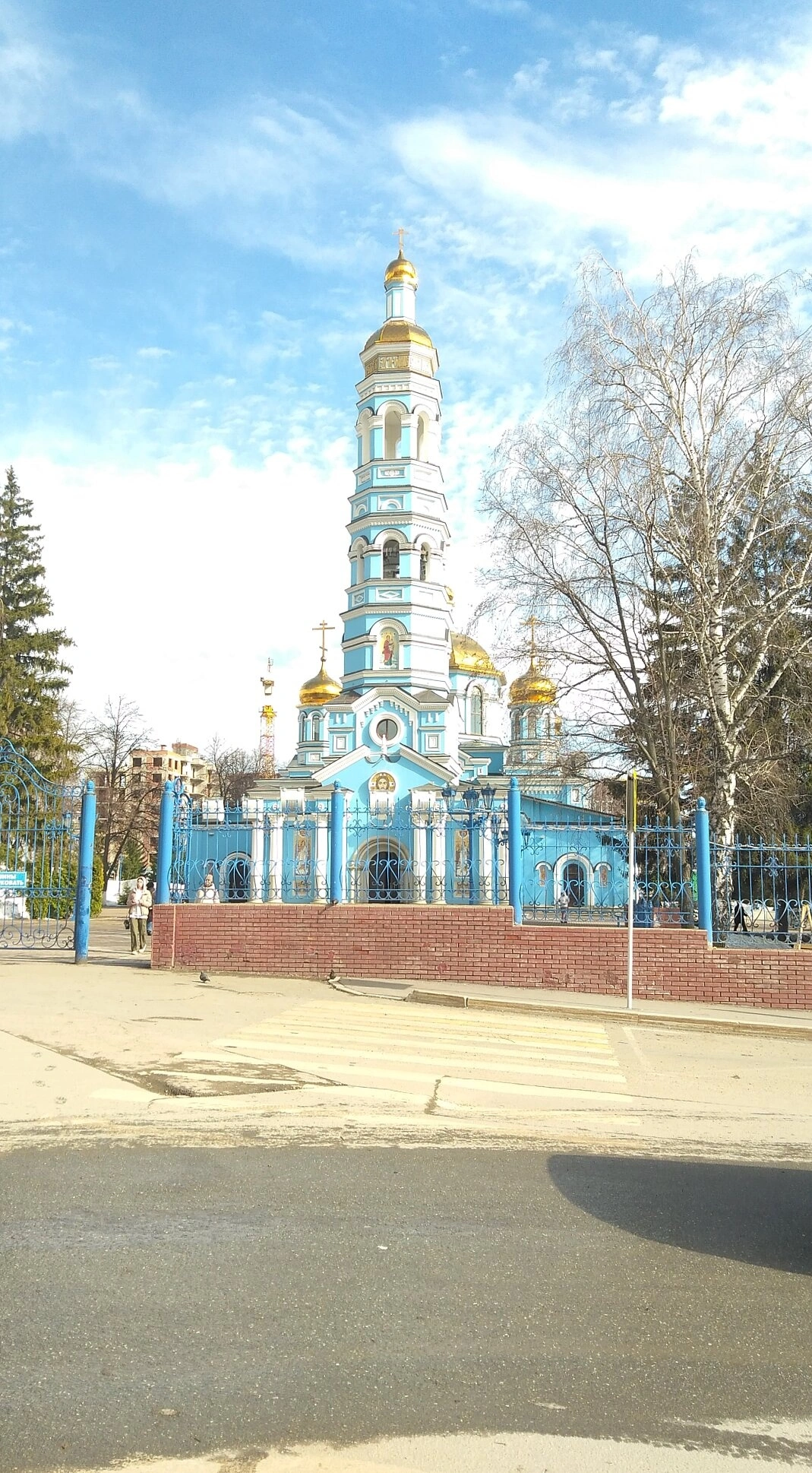 На фотографии запечатлён Кафедральный собор Рождества Пресвятой Богородицы, являющийся главным православным храмом Уфы и всей Башкирской митрополии. Величественное белоснежное здание с нарядным декоративным убранством устремляется ввысь своими ярусами и завершается высоким золочёным шпилем, увенчанным крестом. Особую праздничность и узнаваемость облику собора придают синие луковичные купола, украшенные золотыми звёздами, и сияющие на солнце золотые главки.