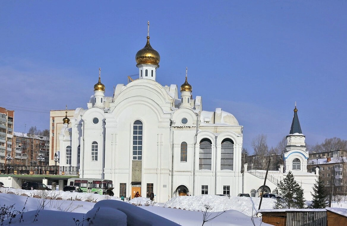 На представленной фотографии запечатлён величественный Кафедральный собор во имя преподобного Серафима Саровского, являющийся кафедральным собором Златоустовской епархии. Храм располагается в городе Златоусте Челябинской области и представляет собой выдающийся памятник православной архитектуры современного периода.