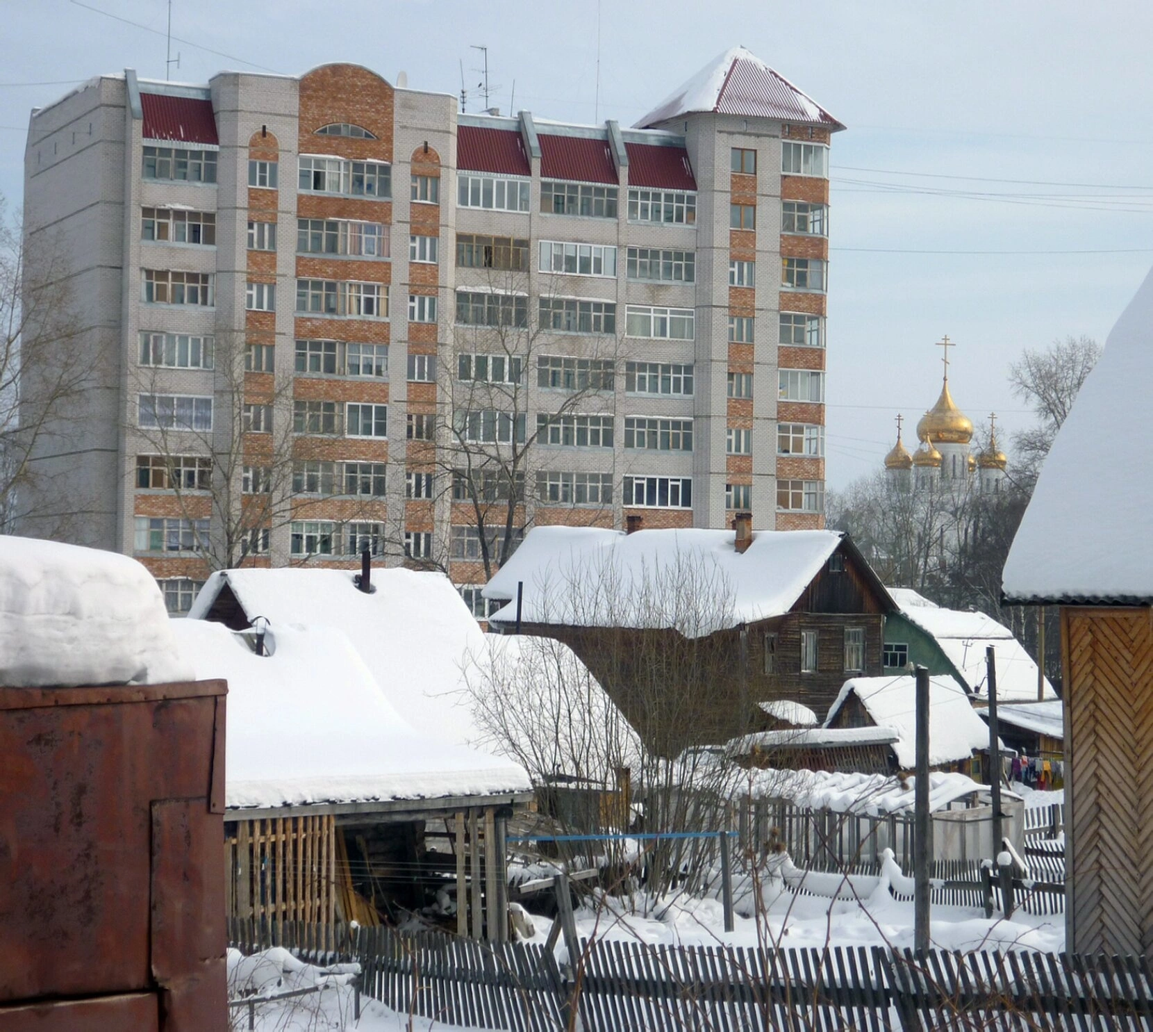 На представленной фотографии запечатлён величественный зимний пейзаж в столице Республики Коми — городе Сыктывкаре. На переднем плане видны традиционные деревянные постройки, характерные для северной архитектуры, укрытые пушистым снежным покровом. Деревянный забор и старинные здания создают атмосферу провинциального уюта и покоя.