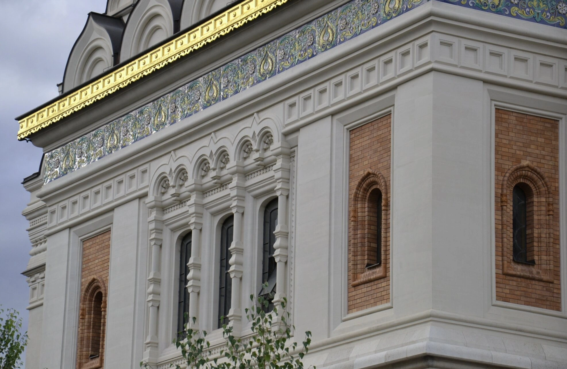 Фотография позволяет рассмотреть характерные элементы, напоминающие о традициях древнерусского церковного зодчества, которые были творчески переосмыслены при строительстве храма в иноземных землях. Каждый архитектурный фрагмент несёт в себе отблеск Небесного Иерусалима, являя образ красоты и гармонии православной веры.