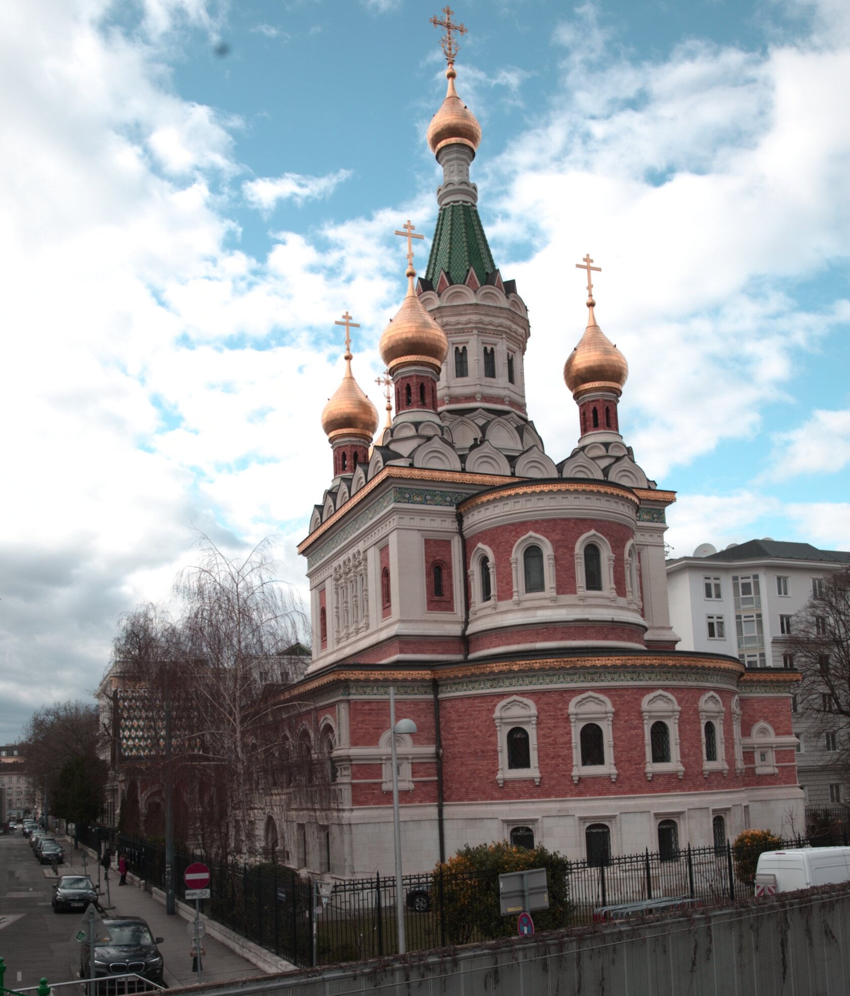 На фотографии запечатлён величественный Кафедральный собор во имя Святителя Николая Чудотворца в столице Австрии — Вене. Этот выдающийся памятник русского церковного зодчества за границей был возведён в 1893–1899 годах по проекту архитектора Григория Ивановича Котова для нужд российской дипломатической миссии и православных верующих австрийской столицы.