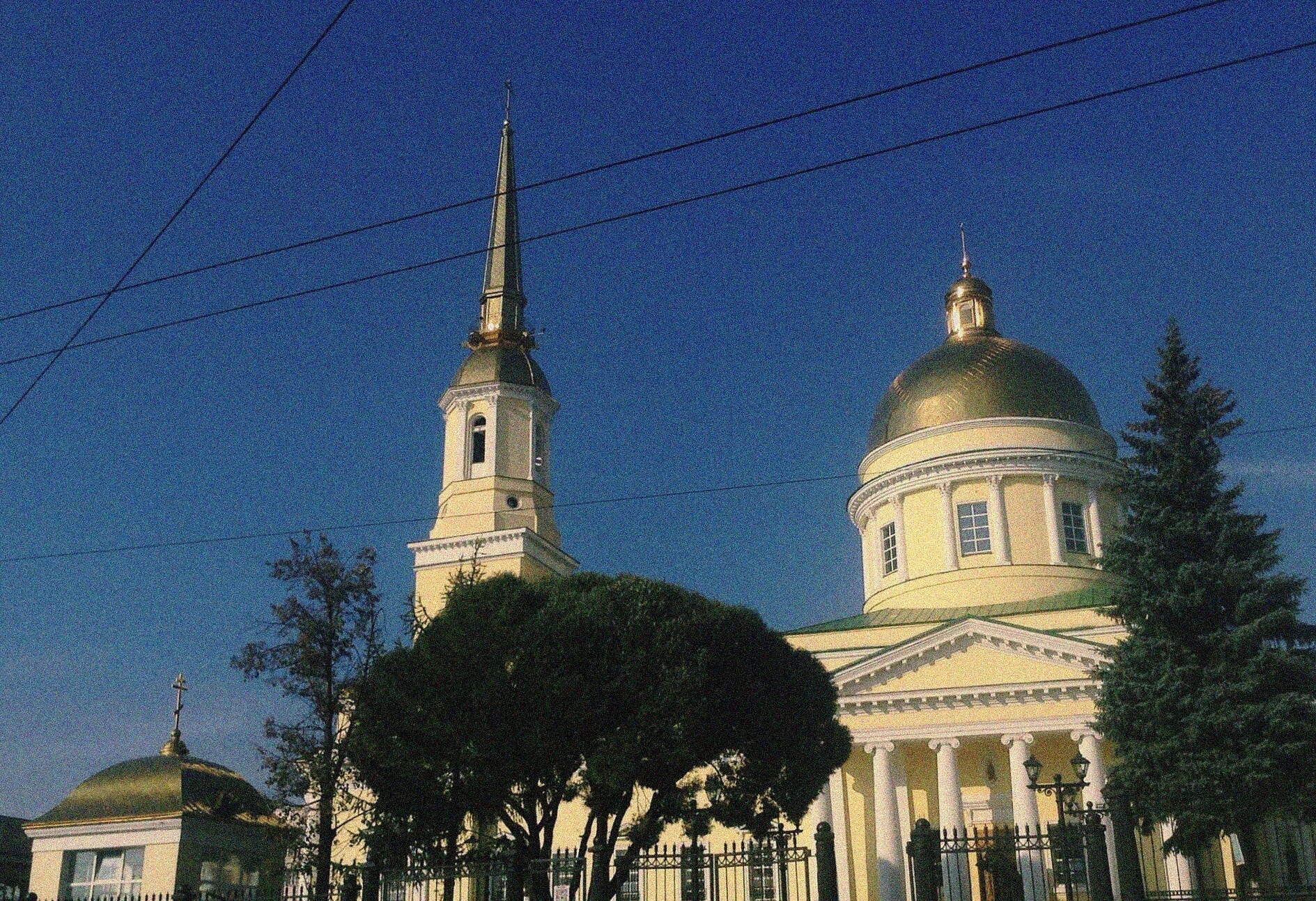 Храм представляет собой выдающийся памятник архитектуры эпохи русского высокого классицизма. На снимке чётко видны его характерные черты: монументальный основной объём, увенчанный мощным золочёным куполом на высоком световом барабане, и стройная многоярусная колокольня, завершающаяся острым шпилем. Фасад украшен строгим портиком с белоснежными колоннами, что придаёт всему облику собора торжественность и благородную строгость.