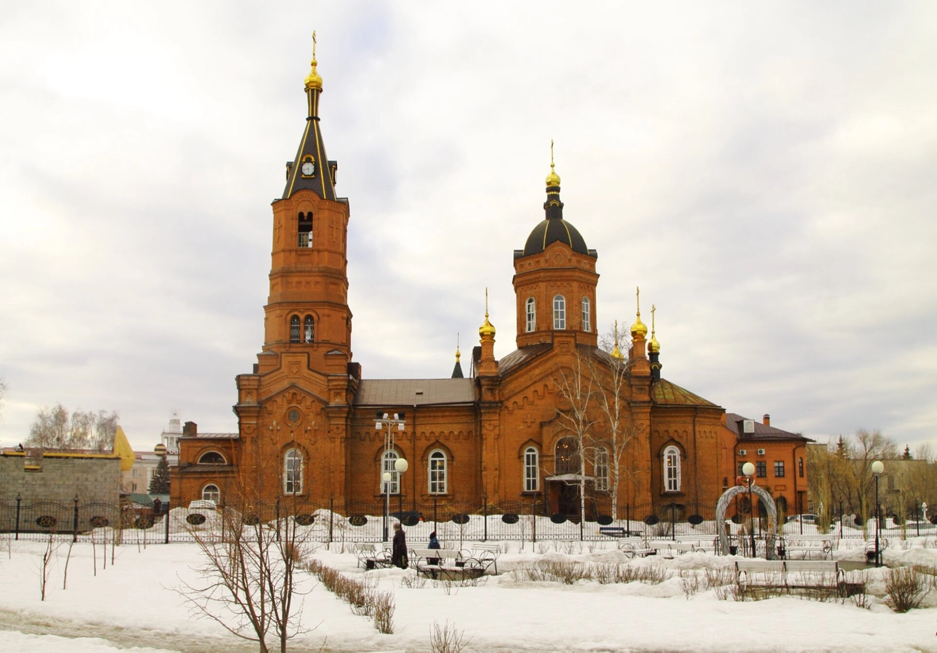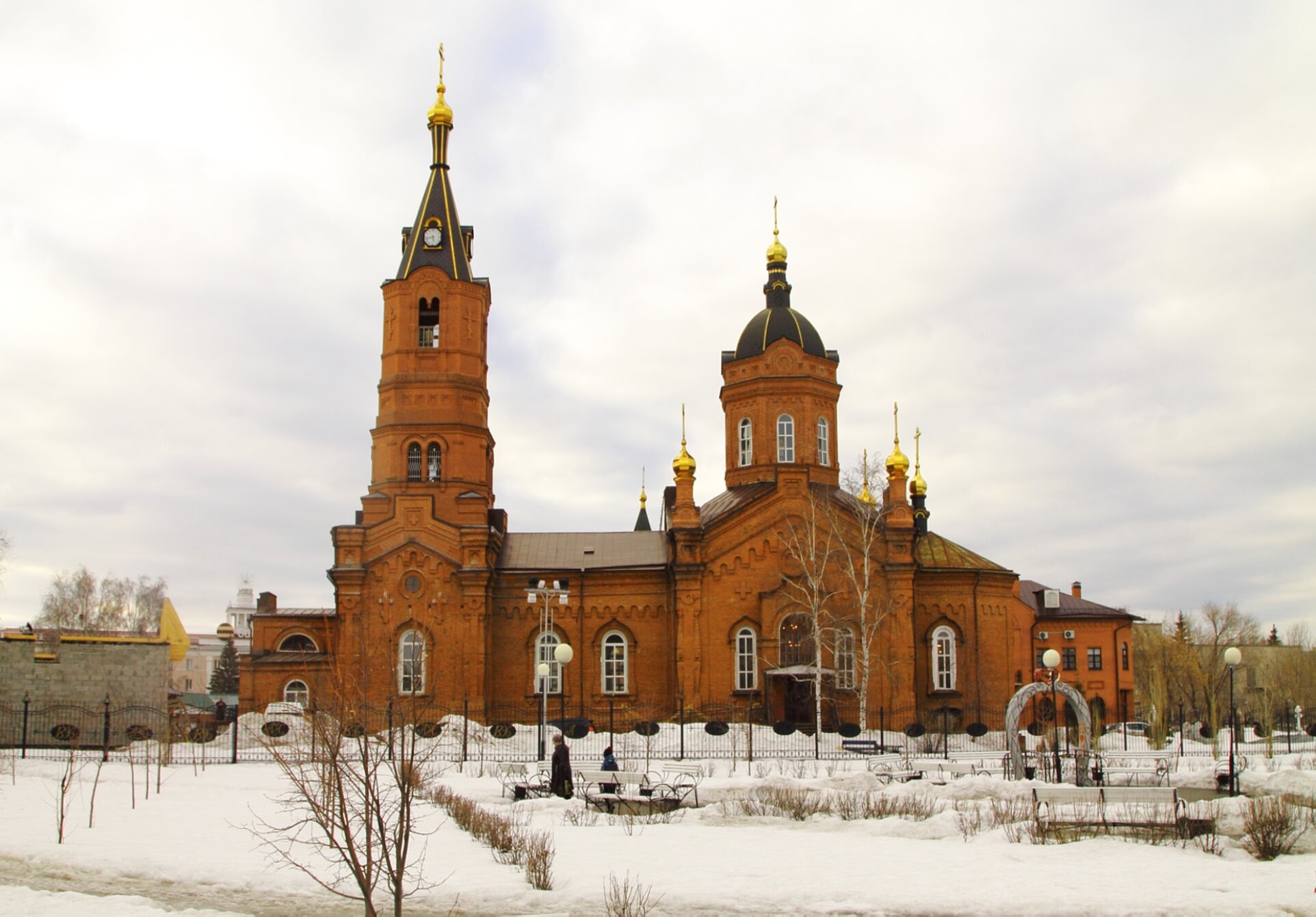 Собор увенчан несколькими золочёными куполами, символизирующими Господа Иисуса Христа и четырёх евангелистов. Высокая колокольня с золочёной главкой устремляется ввысь, напоминая о молитвенном предстоянии перед Богом. На переднем плане фотографии виднеются скамьи и элементы благоустройства храмовой территории, покрытые чистым снегом, а также деревья с оголёнными ветвями, что подчёркивает зимнее время года.