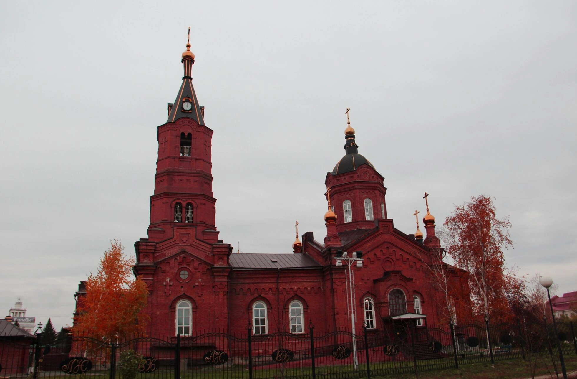 На снимке, сделанном в осеннюю пору, собор предстаёт в окружении деревьев с пожелтевшей листвой, что придает образу особую поэтичность и величие. Пасмурное небо на фоне подчёркивает монументальность и строгость архитектурных форм. Храм обнесён невысокой оградой, а его арочные окна и богатый кирпичный декор фасада свидетельствуют о высоком мастерстве строителей.