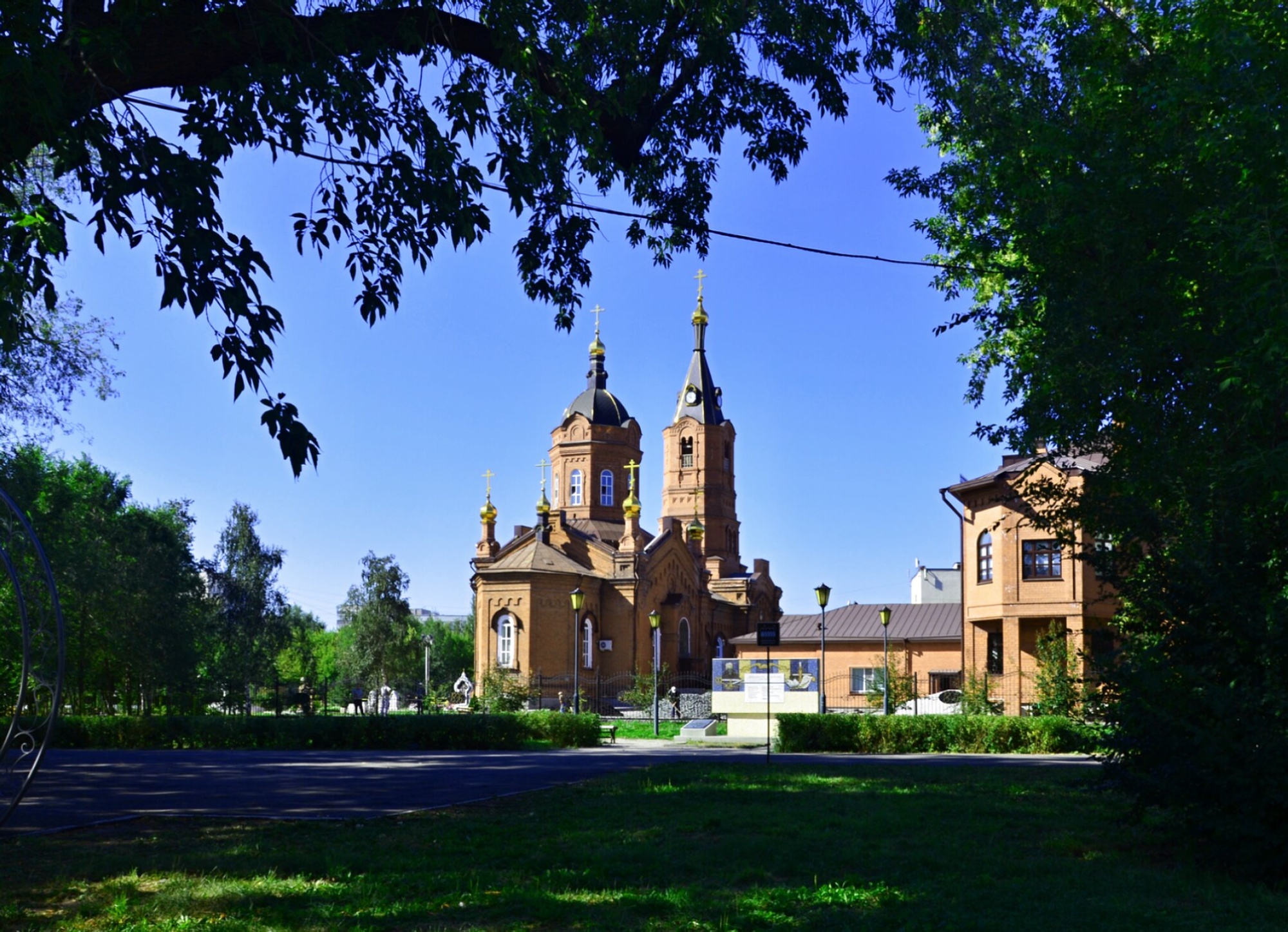 На представленной фотографии запечатлён кафедральный собор во имя святого благоверного великого князя Александра Невского, являющийся главным православным храмом города Кургана и кафедрой правящего архиерея Курганской епархии. Величественное здание собора, исполненное из красного кирпича, возносит к ясному небу свои златые главы, увенчанные святыми крестами, символизирующими победу Жизни над смертью.