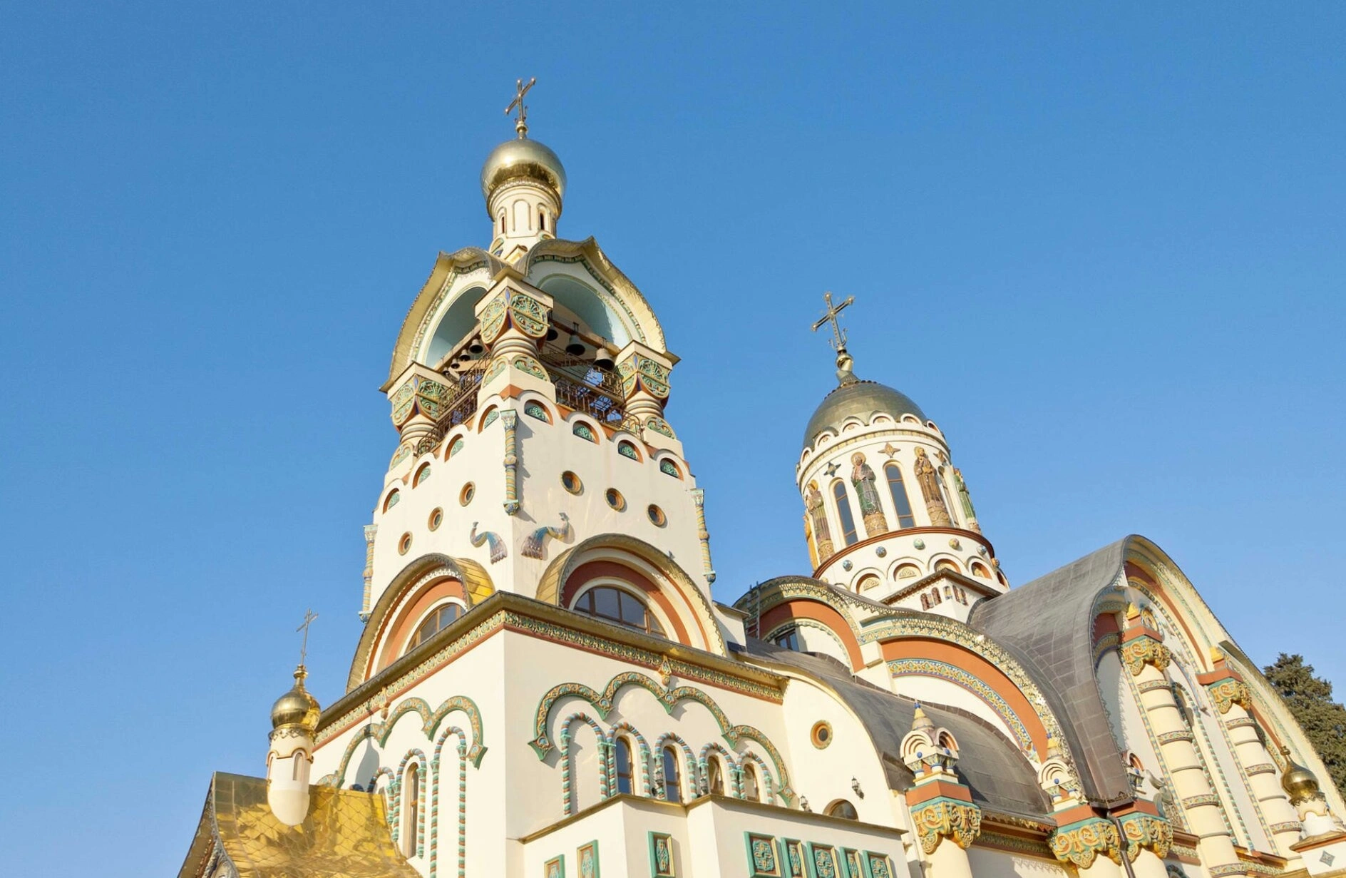 Снимок позволяет детально рассмотреть прекрасный образец современного русского церковного зодчества, выполненного в традиционном стиле. Храм увенчан золочёными куполами, сияющими на солнце и символизирующими свет Христовой веры. Над главным куполом возвышается крест, утверждающий победу над грехом и смертью. Фасад здания украшен изящными кокошниками, аркатурными поясами и килевидными закомарами, что придаёт ему торжественный и нарядный вид, напоминающий о лучших традициях древнерусского храмового строительства.