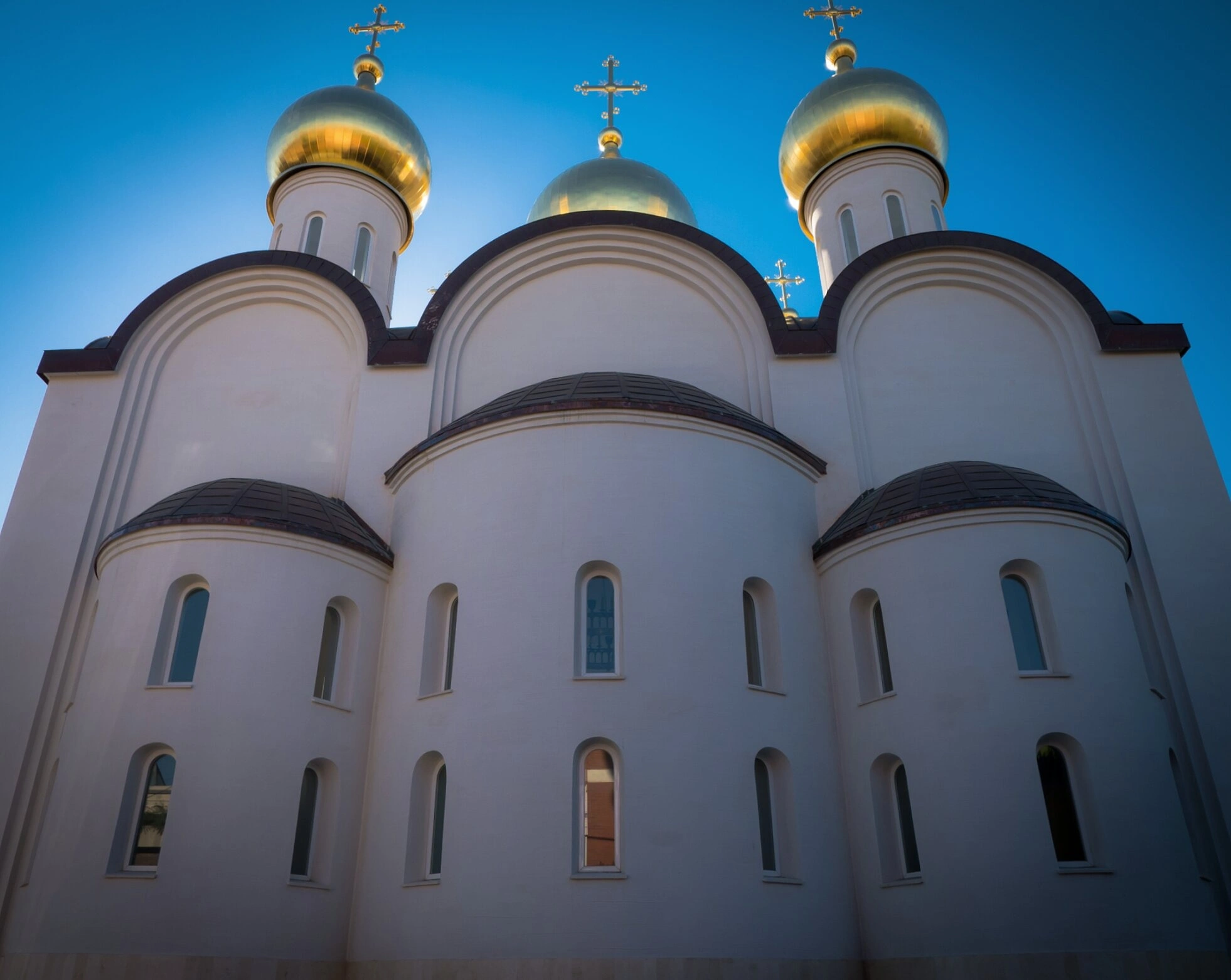На фотографии запечатлён величественный Кафедральный собор во имя Святой Равноапостольной Марии Магдалины, являющийся главным храмом Мадридской епархии Русской Православной Церкви. Снимок сделан в ясный день, благодаря чему белоснежные стены храма и сияющие на солнце золотые купола с крестами эффектно контрастируют на фоне безоблачного голубого неба.