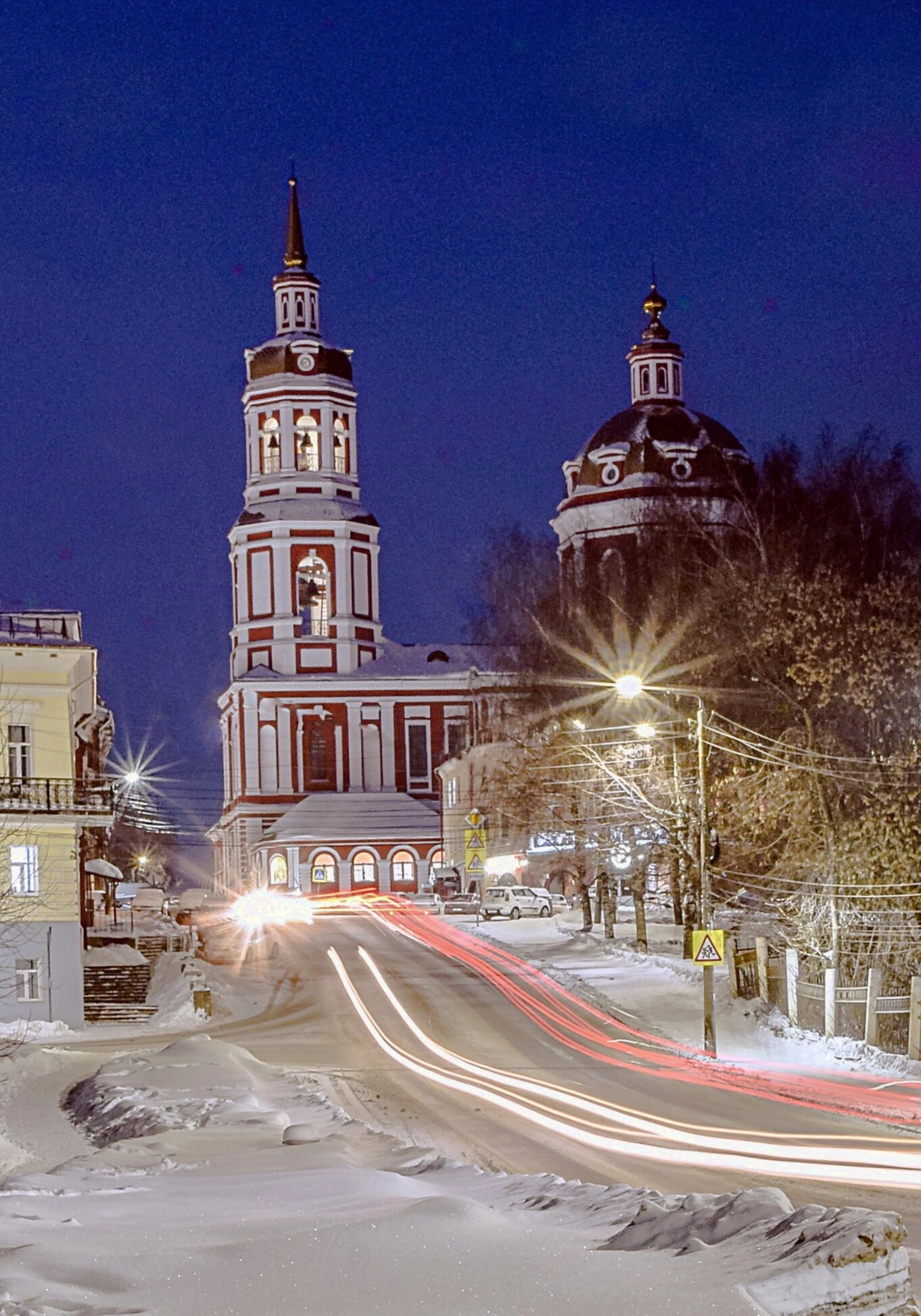На представленной фотографии запечатлён величественный вид кафедрального собора в честь Спаса Нерукотворного Образа, что возвышается на Спасской улице в граде Кирове (в прошлом — Вятке). Ночное зимнее освещение и мягкий снежный покров придают древней святыне особую благоговейную торжественность и величие. Длинная выдержка фотосъёмки создала световые шлейфы от проезжающих автомобилей, которые, подобно свечению неугасимых лампад, подчёркивают устремлённость храма в небесную высь.