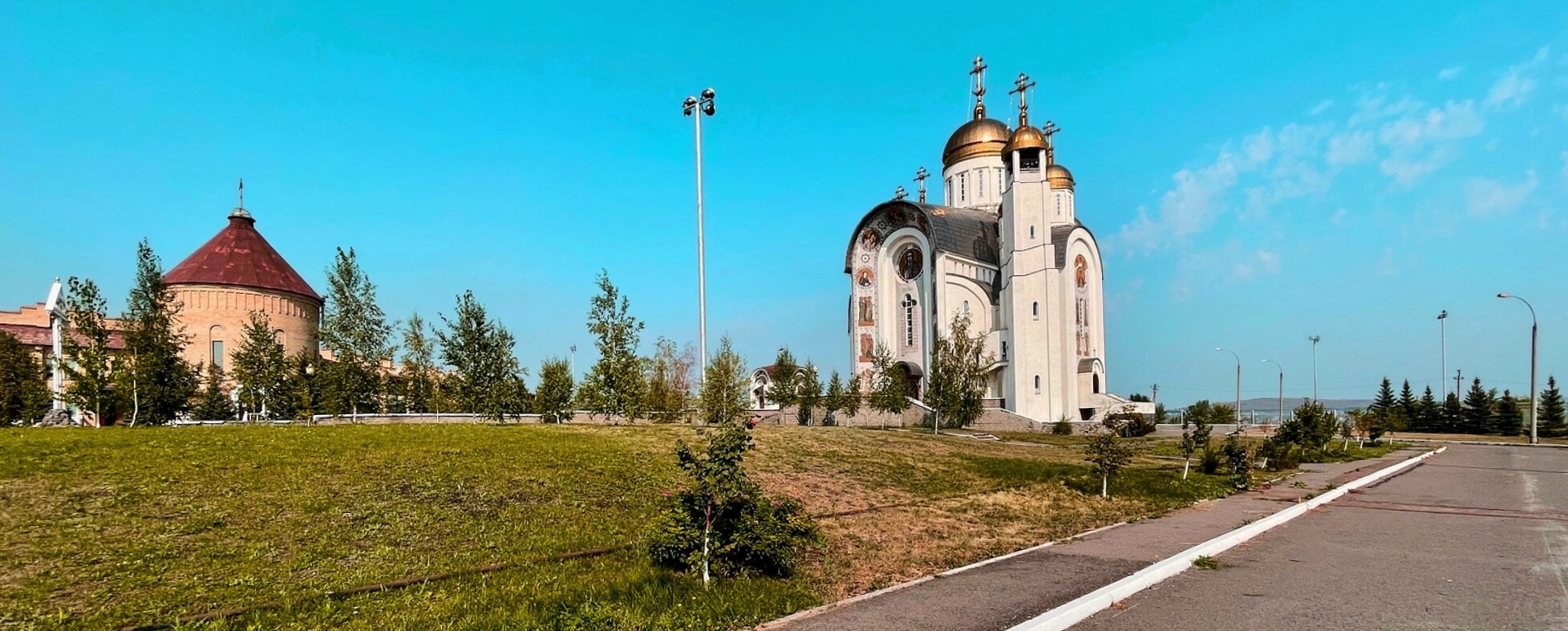 На фотографии запечатлён величественный Кафедральный собор Вознесения Господня, являющийся главным православным храмом Магнитогорска. Собор, освящённый в честь одного из двунадесятых праздников, возвышается на правом берегу реки Урал, символически соединяя два континента и духовно объединяя жителей города.