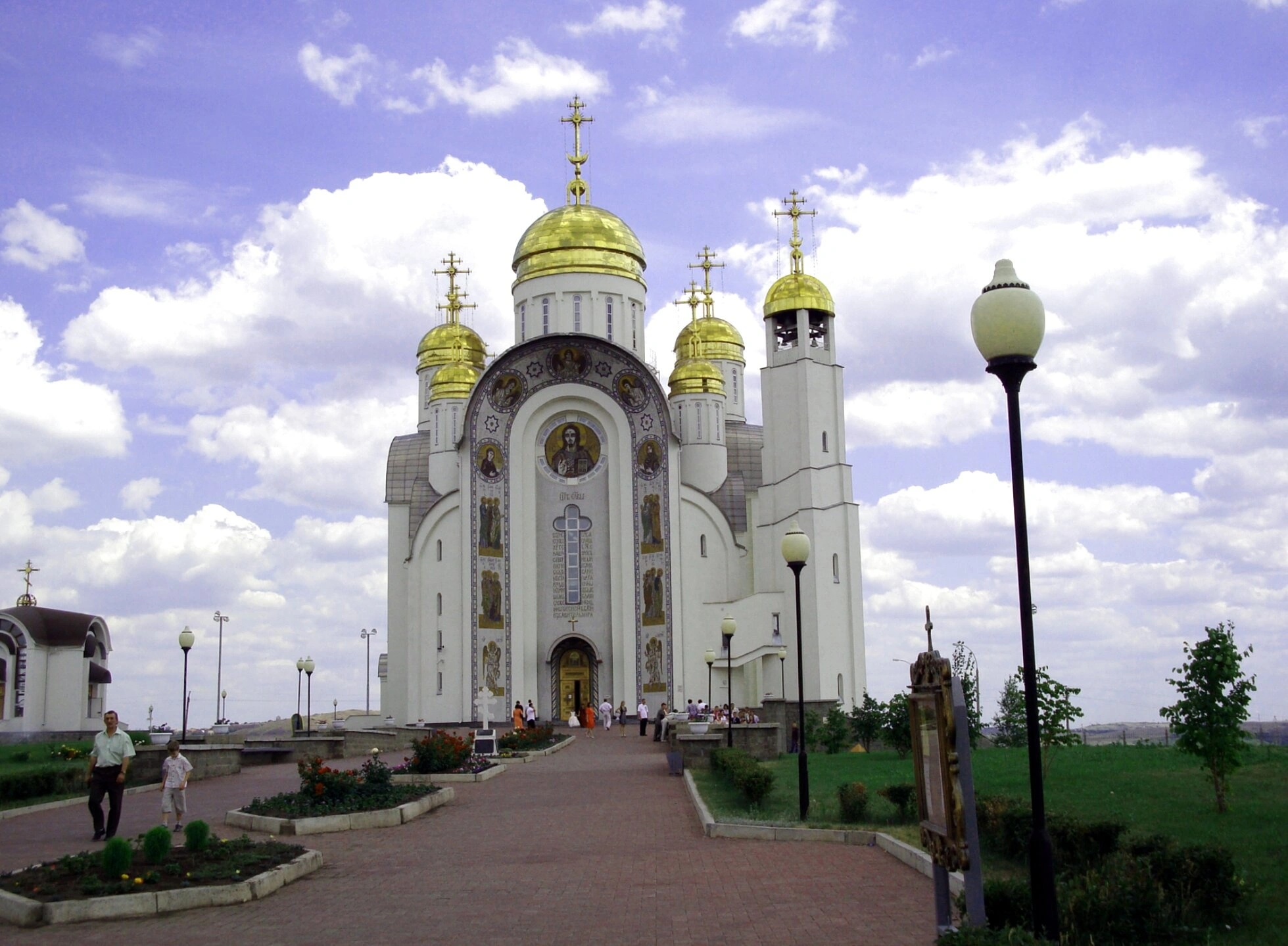 На переднем плане фотографии видна благоустроенная территория собора: аккуратные дорожки, ведущие к святым вратам, и элементы ландшафтного дизайна, которые гармонично сочетаются с духовной строгостью места. Несколько человек, прогуливающихся по площади, помогают оценить монументальный масштаб и величие всего архитектурного комплекса.
