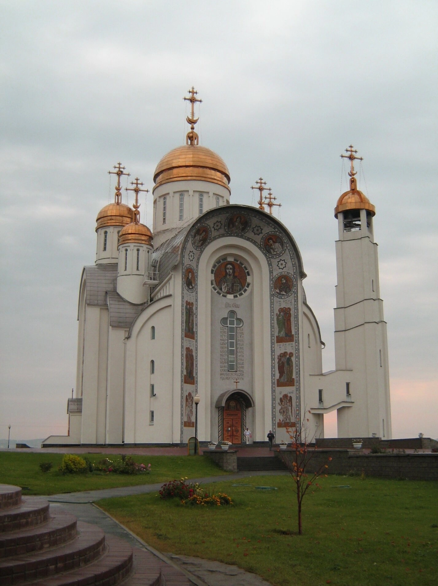 Белоснежный семиглавый собор, увенчанный златоглавыми куполами с сияющими крестами, представляет собой образец современной церковной архитектуры, выполненной в лучших традициях русского храмового зодчества. Над основным объёмом храма гордо возносится стройная колокольня, а фасады украшены благочестивыми орнаментами и священными изображениями.