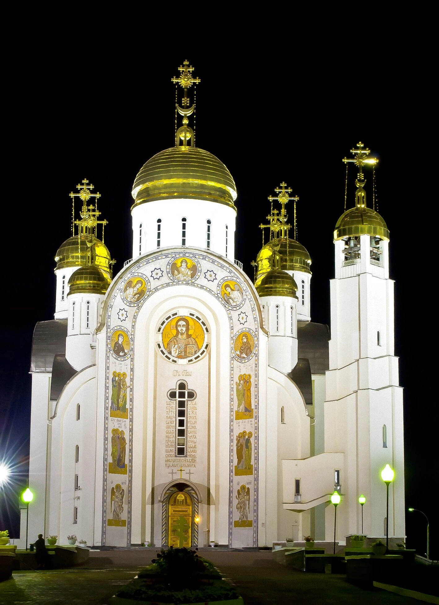 На фотографии запечатлён Кафедральный собор в честь Вознесения Господня, являющийся главным православным храмом Магнитогорска. Ночная съёмка позволяет увидеть величественный белокаменный семиглавый собор в искусственной подсветке, которая эффектно выделяет его архитектурные формы на тёмном небе и подчёркивает благолепие золотых куполов, увенчанных священными крестами.