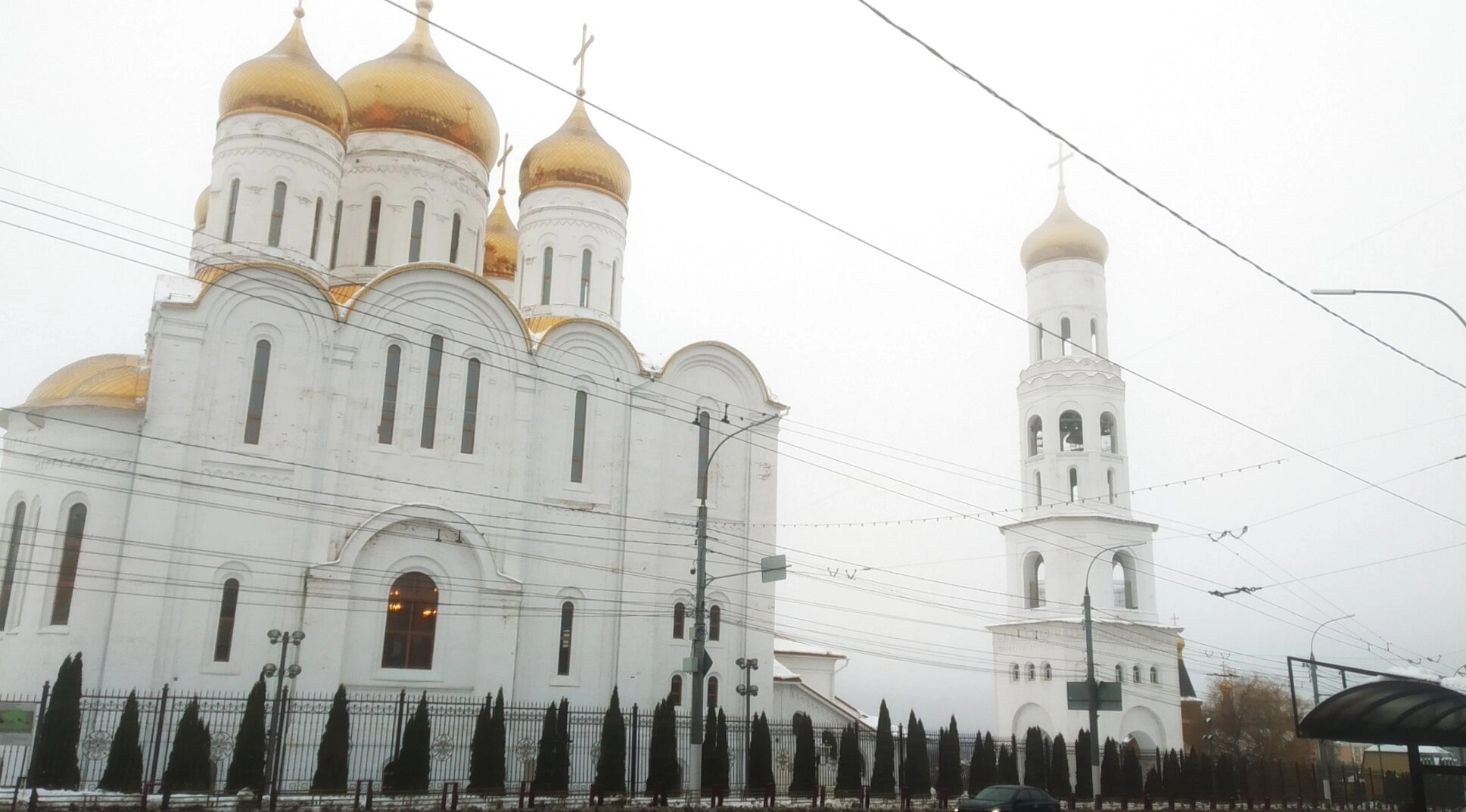 На представленной фотографии запечатлён величественный ансамбль Кафедрального собора во имя Святой Живоначальной Троицы и колокольни «Пересвет» в городе Брянске. Этот собор является кафедральным православным храмом Брянской епархии и духовным центром всего региона.