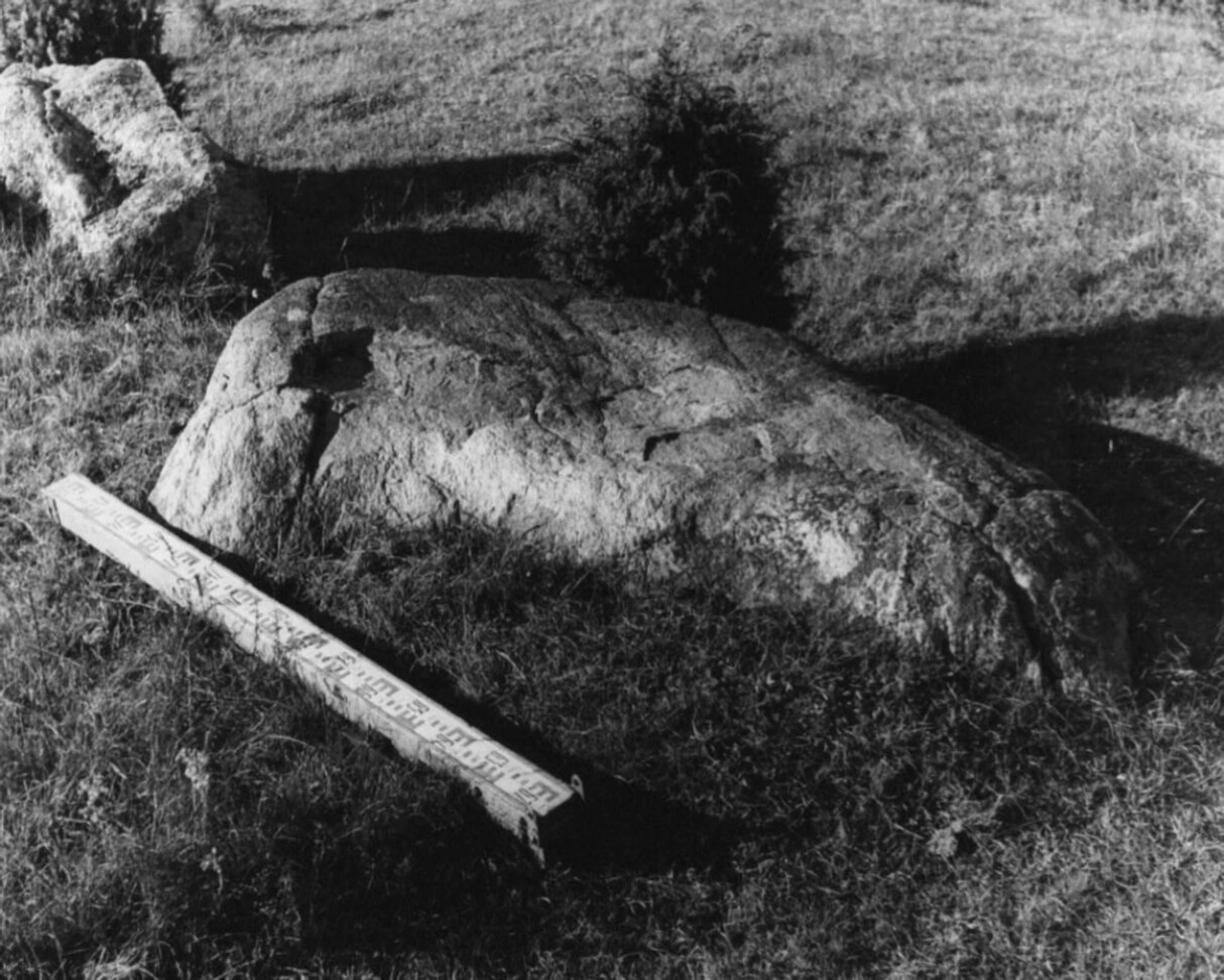 Рядом с валуном находится деревянная доска с нанесёнными метками, вероятно предназначенная для проведения замеров или исследований. Данный артефакт может свидетельствовать о проводимых на территории храма работах по изучению и сохранению исторического наследия.