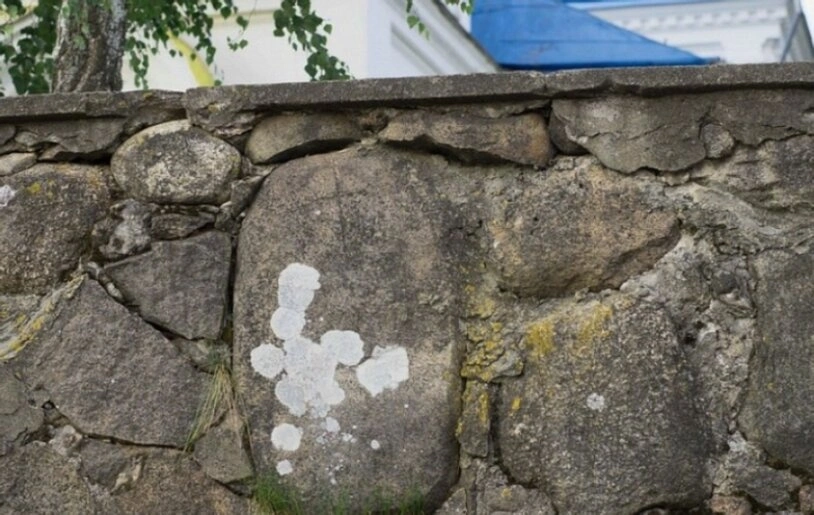 Белые пятна лишайников на одном из центральных камней особенно выделяются, подчёркивая многовековую историю этой православной святыни. В верхней части снимка угадывается фрагмент синей кровли храма и ветви дерева с зелёной листвой, что указывает на расположение церкви в уединённом, живописном месте, окружённом природой. Эта стена — не просто ограждение, а немой свидетель многих молитв, вознесённых под сводами этого дома Божьего, символ незыблемости и прочности православной веры на белорусской земле.