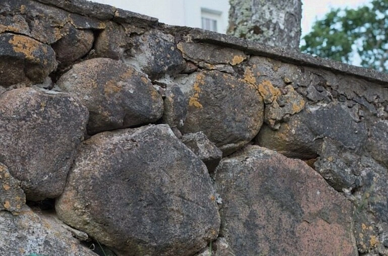 На представленной фотографии запечатлён фрагмент капитальной стены православного храма в честь Успения Пресвятой Богородицы, расположенного в агрогородке Ручица Минской области. Кладка выполнена из крупных, необработанных валунов различного размера, характерных для белорусского пограничья, что придает стенам особую монументальность и суровую красоту. Камни тёмного, серо-коричневого оттенка скреплены прочным раствором и местами покрыты патиной времени — желтовато-зеленым мхом и лишайником, что подчёркивает исторический возраст святыни.
