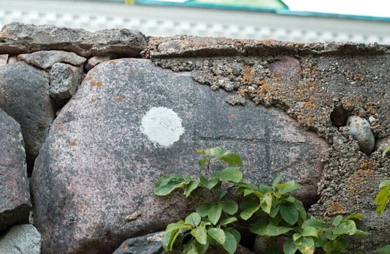 На одном из камней в центральной части стены различим небольшой белый круглый знак, возможно, являющийся меткой каменотёсов или поздней отметкой. Поверхность камней и раствора покрыта слоем мха и лишайников, что подчёркивает почтенный возраст сооружения и его единение с природой. У подножия стены произрастают зелёные кустарники, добавляющие кадру живости и красок.