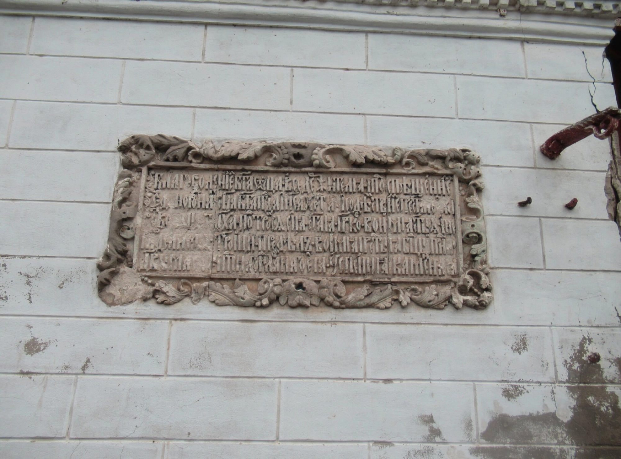 Надпись на плите требует тщательного изучения эпиграфистами, но несомненно несёт в себе мемориальный или летописный характер, возможно, увековечивая имена ктиторов или важное событие из жизни прихода. Декоративные элементы, окружающие текст, включают в себя традиционные православные символы и геометрические узоры, характерные для церковного искусства XVII-XVIII веков.