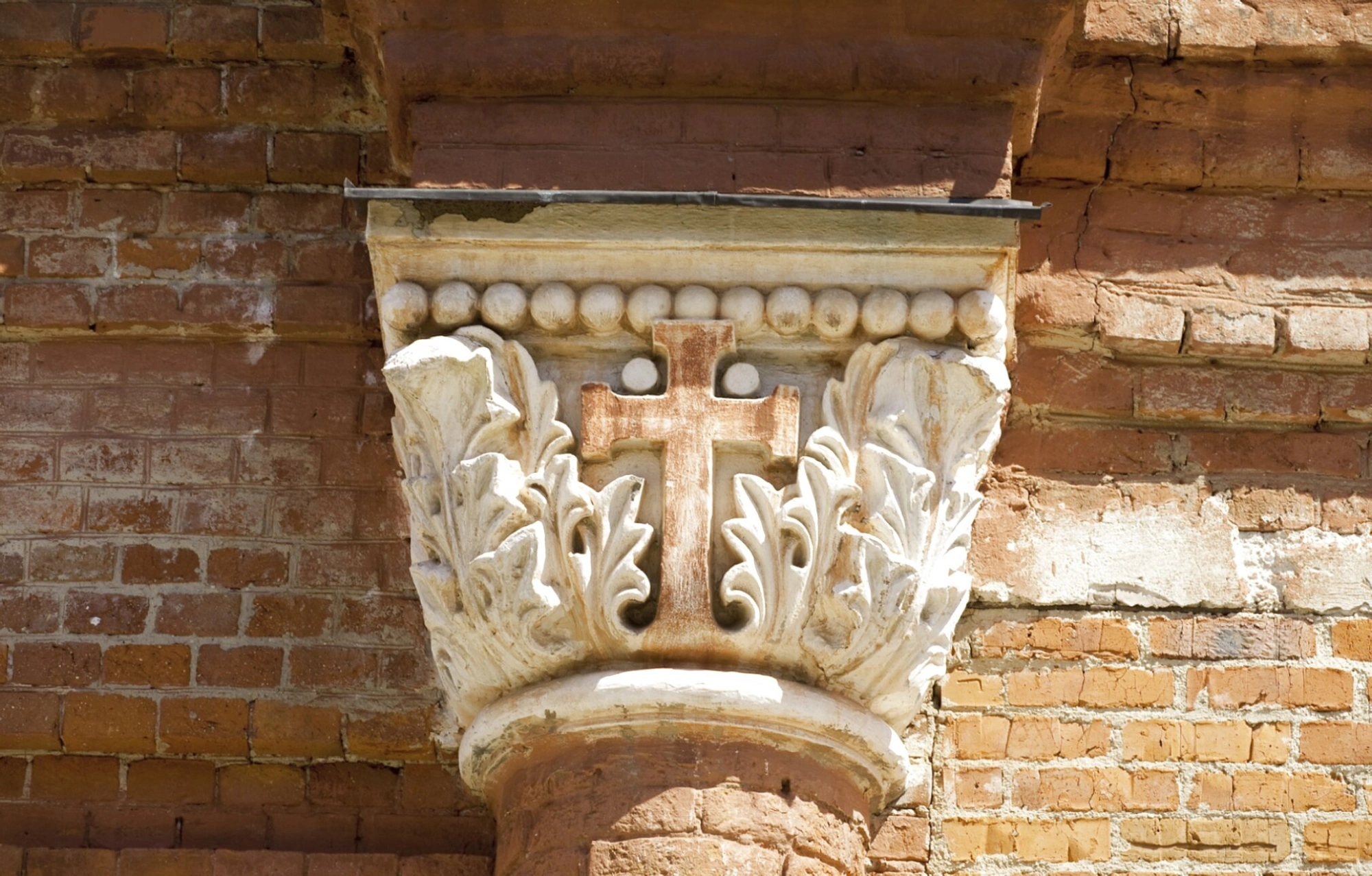 Капитель украшена искусной резьбой с растительным орнаментом, символизирующим Древо Жизни и духовное возрастание верующих. В центральной части композиции размещено изображение креста — главного символа христианского вероучения, знаменующего искупительную жертву Спасителя. Сочетание геометрических форм и растительных мотивов демонстрирует высокое мастерство церковных зодчих.
